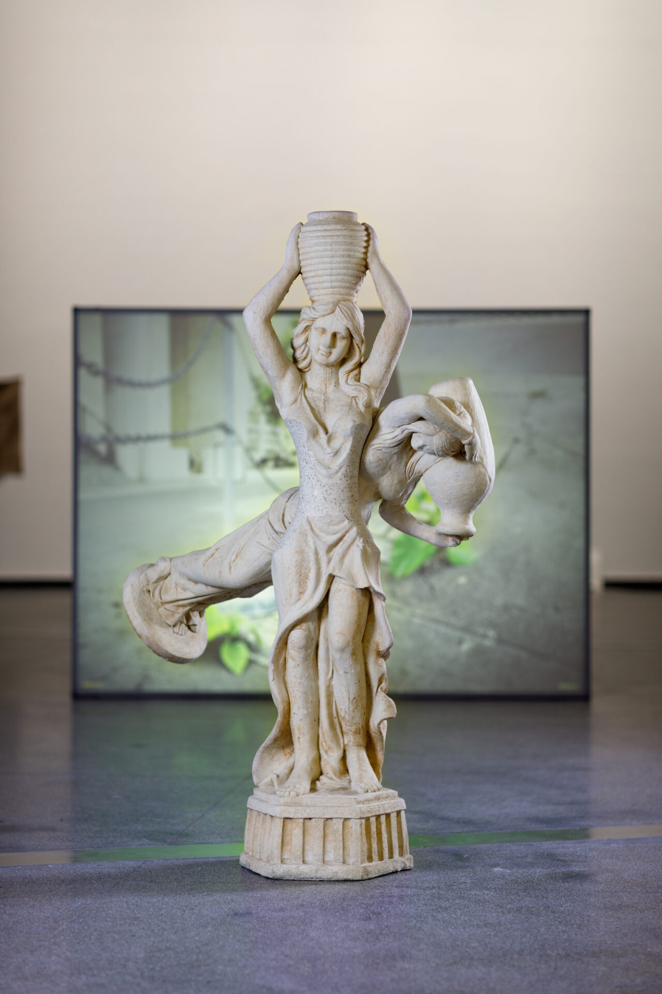 The exhibition spaces at ACCA initially mimic the dactylic poetic metre of Ovid’s Metamorphoses: one long room followed by two short ones. The first long foot presents about a dozen works that pivot around a central sculpture, Fixed Fountain (2021) by Jean-Luc Moulène, itself pivoting and doubled on the axis of the figure’s centre of gravity, suggesting a transition from an upright portrait format to a sideways landscape one. This shift along the axis of two European pictorial genres is cast by Mircan as yet another motif of transformation. It is suggested as well in Becky Beasley’s P.A.N.O.R.A.M.A. (2010), postcards depicting segments of Eadweard Muybridge’s fenced Victorian garden, taking the portrait format of the postcard and turning it into an unending panorama of pictures spinning on a carousel.