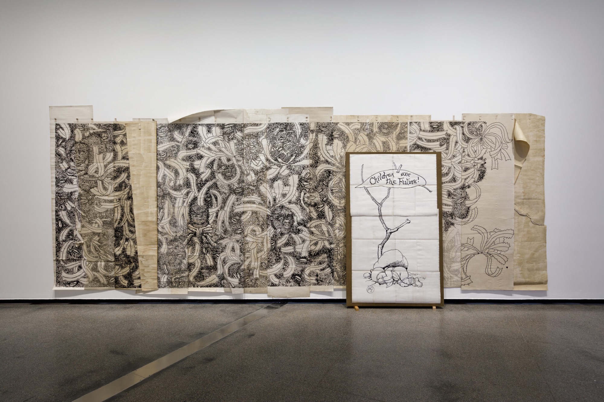 Rather than Moulène’s Fixed Fountain (2021), the true pivot of ACCA’s main gallery is the brightly painted Kawun (2005) by Wingu Tingima. Remarkably, the Seven Sisters dreaming, which Tingima was a senior custodian of, tells also of eros’s lechery and treachery, this time through the figure of Nyiru who, wanting to snatch one of the fleeing sisters, tries to trick them by transforming himself into a quandong tree.