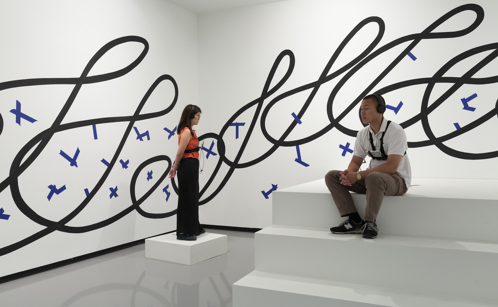 A “wall drawing” of looped calligraphy occupies the visual field, and architectural interventions in the form of empty stages and platforms invite occupation. On the wall are rough crosses of blue painter’s tape, which I later learn where included to provide the software with more visual language to “read”. The calligraphy is a hommage to the artist’s paternal grandmother Margot Snape, a calligrapher, book maker and astrologist.