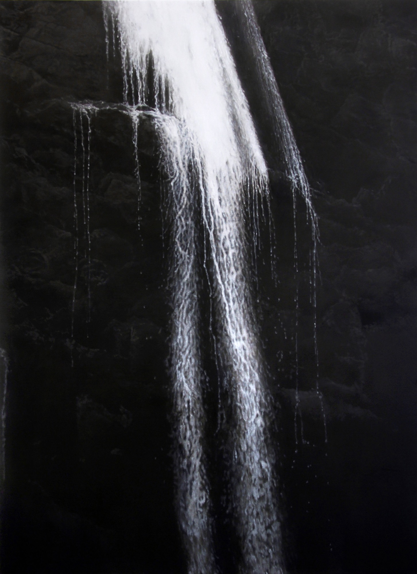 A similar point can be made about Descent, a large oil on linen in which the compositional logic of 'downwardness' is heightened by scale—as well as by artificiality. This downwardness forms part of the show's premise, and is derived from its title Spill, an abstraction from the idea of falling water, which is itself an abstraction from photographs of waterfalls taken by the artist. The work is partly reminiscent of Gerhard Richter's abstracts and photo paintings, such as the blurred Uncle Rudi, 1965, or his well-known overpainted photographs. But Descent lacks that naturalised Richter-esque synthetic tension between photograph and paint seen in the overpainted photographs, for example—that unified pressure of material paint against the ideality of the photograph; an ideality that, in turn, both holds onto the paint and renders it irreal and weightless. Unlike Richter's photographic surface, in Descent the black primed linen does not synthesise with its overlayed paint into a resolved compositional tension. Each layer floats passively up against the other. Even fateful splatters of paint abolish their sense of chance, in that each one feels half intended, artificial, placed. The surface is slippery like a perimeter fence, unwelcome to the paint that descends its surface.