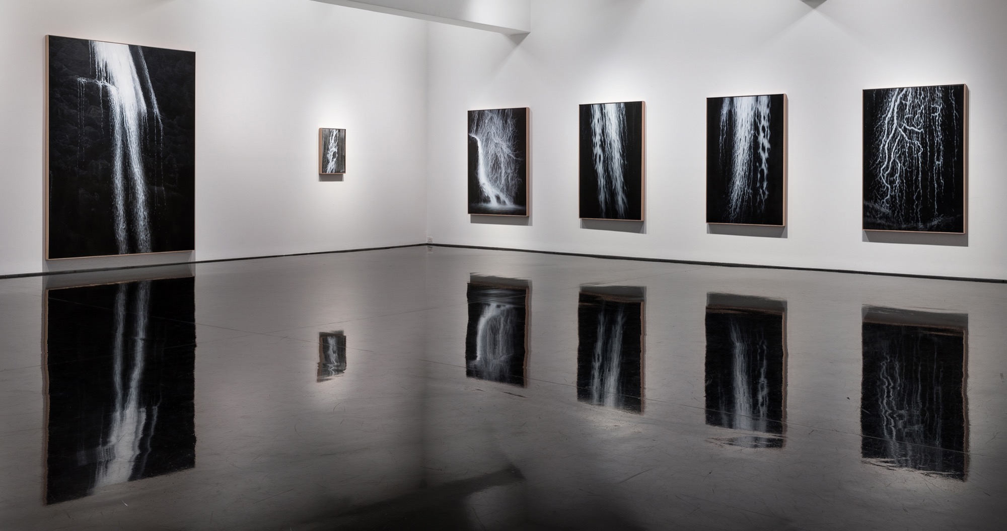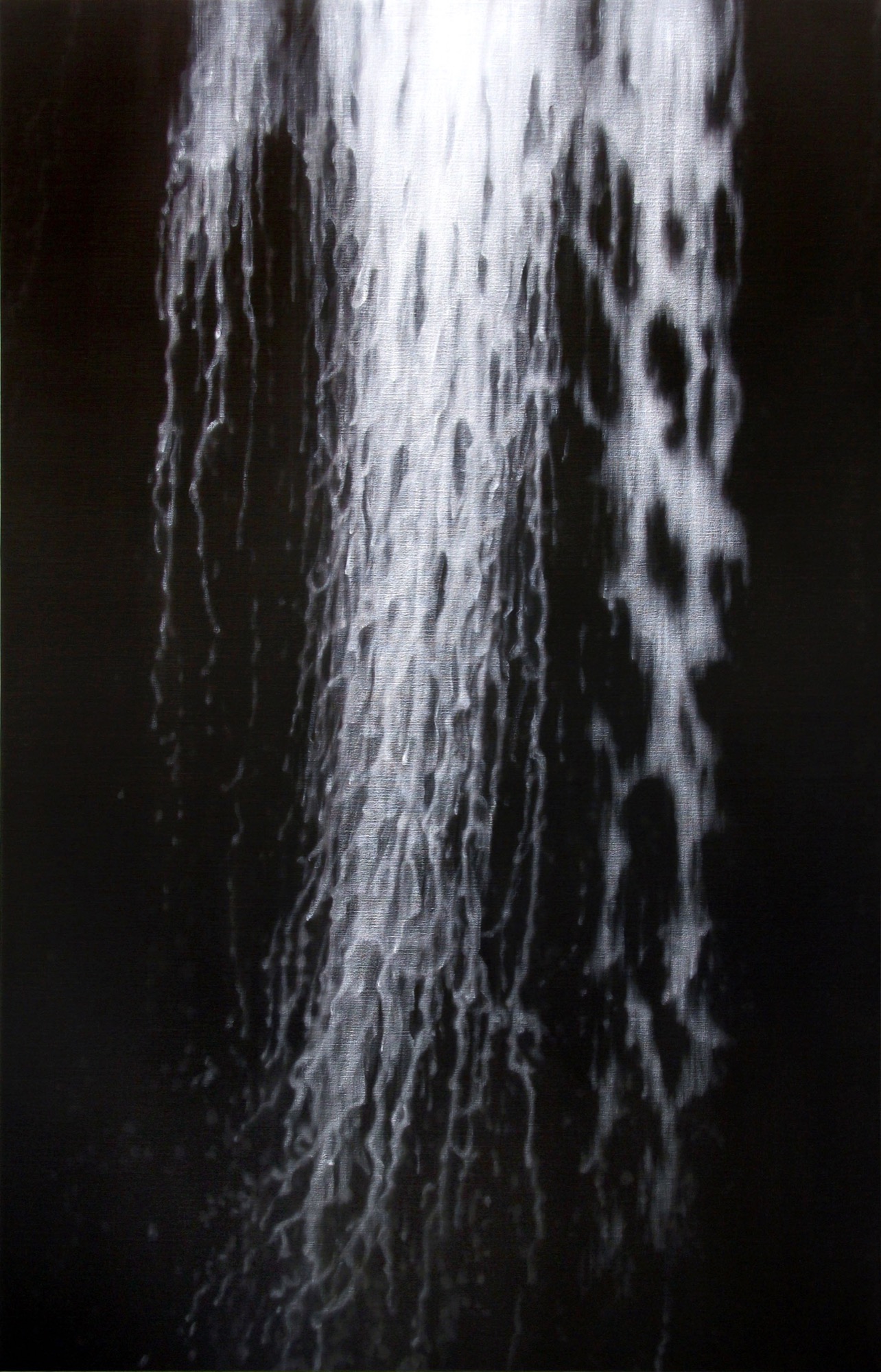 The flattest of all the works—and smallest—Silver Spill, breaks with the idealised downward direction (i.e., the idea of the 'spill' of water) of the show to present a far more even, uniform modernist space. The layering of swathed brush strokes on black primed linen recalls Francis Bacon's 1953 Study after Velázquez's Portrait of Pope Innocent X, except it lacks that sense of a frightful breakout into the abyssal nothing of the painterly ground. In Silver Spill, everything floats forward, once again, in a virtual rather than existential (or even ontological) space.