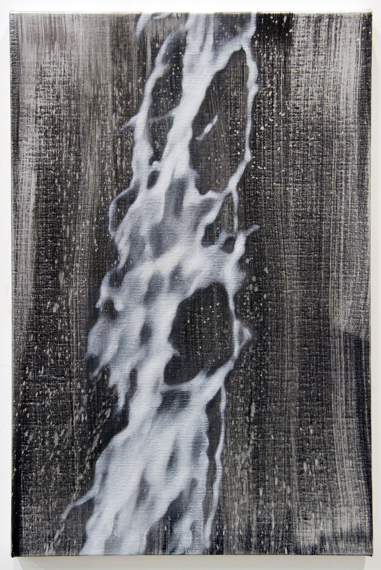 The verticality of the picture support, hung like a portrait, follows that of most the works in the show, only it doesn't use the downward movement of falling water to derive its compositional logic. In Silver Spill, the light silver-ish foreground 'spill' falls up as much as down. The middle-ground swathed brush strokes make the same double move up and down, from a stroke beginning in the lower right corner and lifted upward, to another beginning in the upper right corner and pulled down. Downwardness is also thwarted by the central 'opening' of the foreground silver spill, which anchors and centres the picture, but which is also unbalanced by a second opening slightly above it—and each framing a few splatters of paint as if, like the impressionists, the artist sought to capture a fleeting moment of chance, to harden and abolish accident.