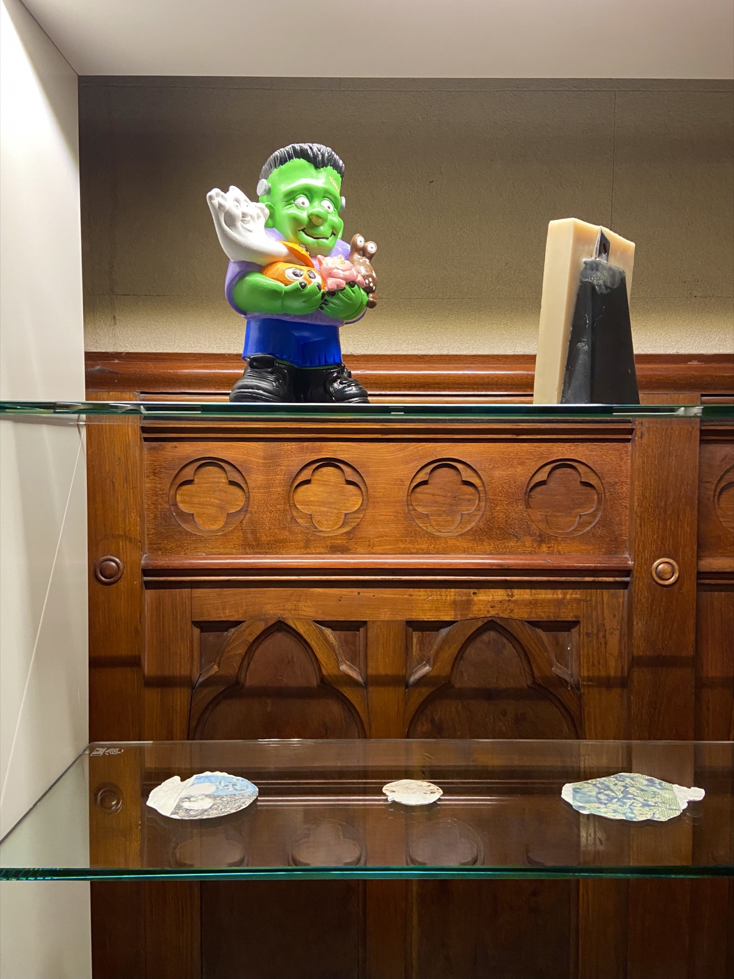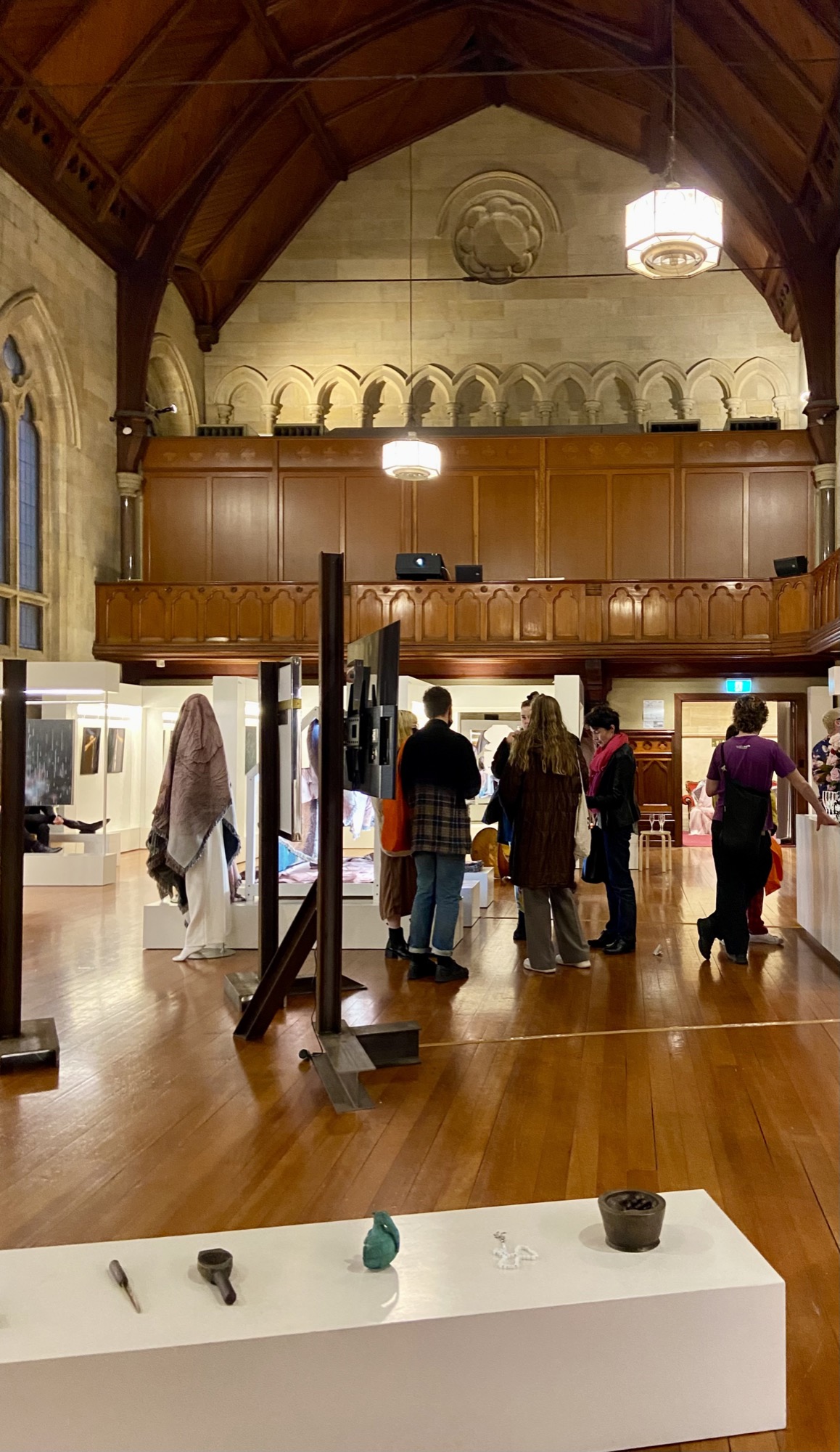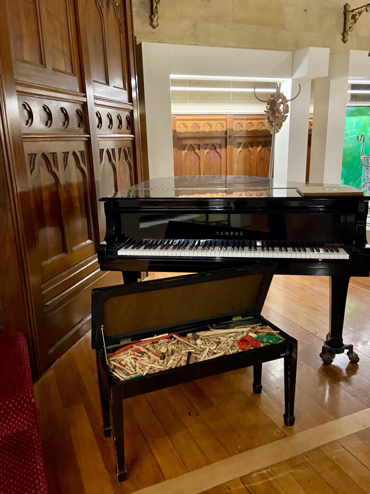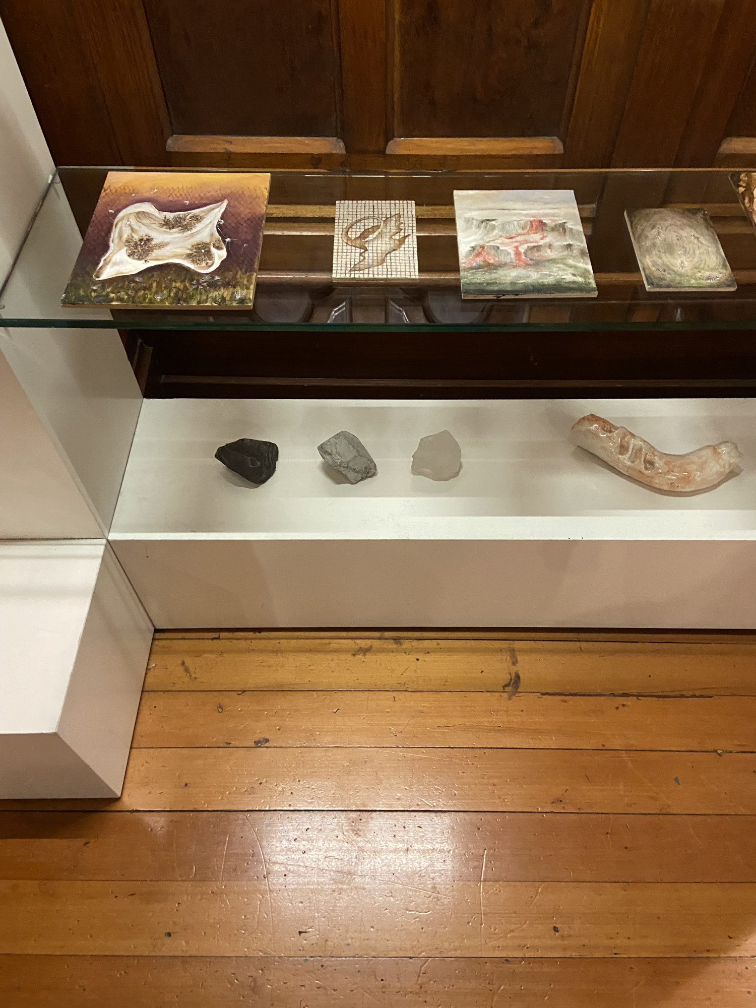 Beard’s gallery, FUTURES, newly minted by Zara Sigglekow (previous gallery manager at Neon Parc) and Steven Stewart, has done well to keep with the site-specific brief of Spring, albeit practically without notice. Eric Demetriou made a couple of slightly panicked responses to the Chapter House that worked. The Folded Piano (2014–2021)—the remains of a woodchipped piano—sat inside the seat of the Chapter’s ebony Yamaha grand. In the stairwell leading into the hall were his beaten 44-gallon drums, titled Bunghole (2013–ongoing). One flight of stairs down are two shiny Koons-esque mushroom sculptures, but those just turned out to be a couple of serendipitously placed old City of Melbourne Christmas decorations. The rest of FUTURES is like a cabinet of curiosities, a nineteenth-century arcades project: gooey fluorescent pieces by Matthew Harris; a long and low plinth displaying bits and bobs from Lara Chamas; there’s various imprint works from Hootan Heydari; and several paintings by the one Gen Z we identified, Matilda Davis, who, like Sigglekow, hails from the elder Neon Parc.