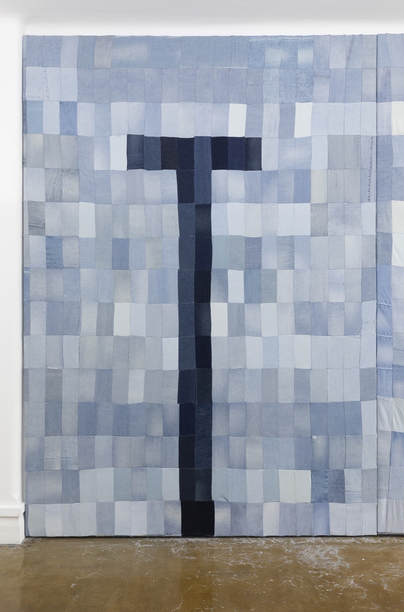 And it is exactly this range of dark and light tones that O’Neill exploits so well in Bourke Street Leisure Centre, with slightly differently coloured denim patches sewn together to produce a beautiful shimmering effect, exactly like light falling across the rippling water of a swimming pool. But also—and this is how the works become painterly—across the tessellation there is also a kind of push and pull of depth, with one’s eye bobbing up and down between the comparative flatness and depth of the lighter and darker blues. “AQUA PROFONDA” is not all equally deep—and, of course, in a witty contradiction, it looks shallow hanging down a gallery wall, just like those horizontal lanes now rise vertically like a cross (and, for those who know their McCahon, they are exactly like his Tau Crosses of the 1970s, alluding both to Christian salvation and the Kumara God, a Māori fertility figure).