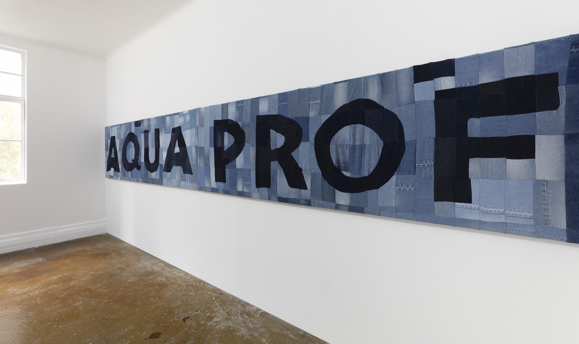 But in the case of Jane O’Neill’s Bourke Street Leisure Centre, currently on at Void_, it’s literally true. You walk up the two flights of stairs to the gallery, enter the door and, splash!, there it is, three lanes of a swimming pool rendered in polyester and cotton on denim on one wall and on the other side of the small room, across two walls, the words “AQUA PROFONDA”, again on top of a shiny series of slightly differently coloured blue denim rectangles.