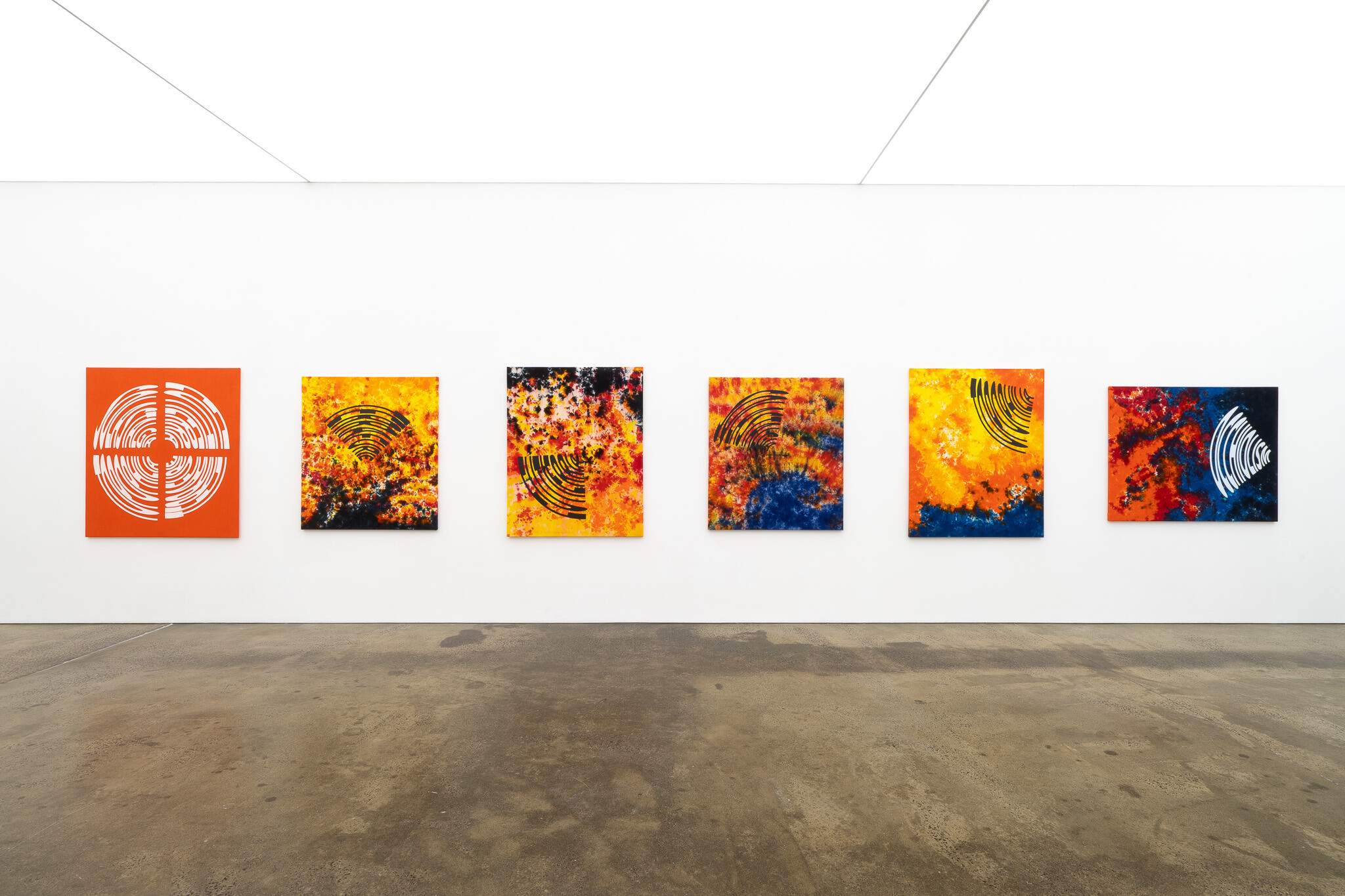 Across from Plot is a series of six works that also make use of fibre-active dyeing, though in a style more immediately associated with traditional tie-dye patterns. Fiery reds and oranges collide with deep ultramarine blues and blackened edges, creating a visual field that feels both cosmic and combustive. The colours bleed and burst across the surface in an almost celestial or volcanic manner—chaotic yet patterned, held in tension by the controlled curves of the white or black text in each work. Unlike traditional tie-dye, which often suggests looseness or ease, this application feels forceful, urgent, even explosive—as if dyed through compression or impact.