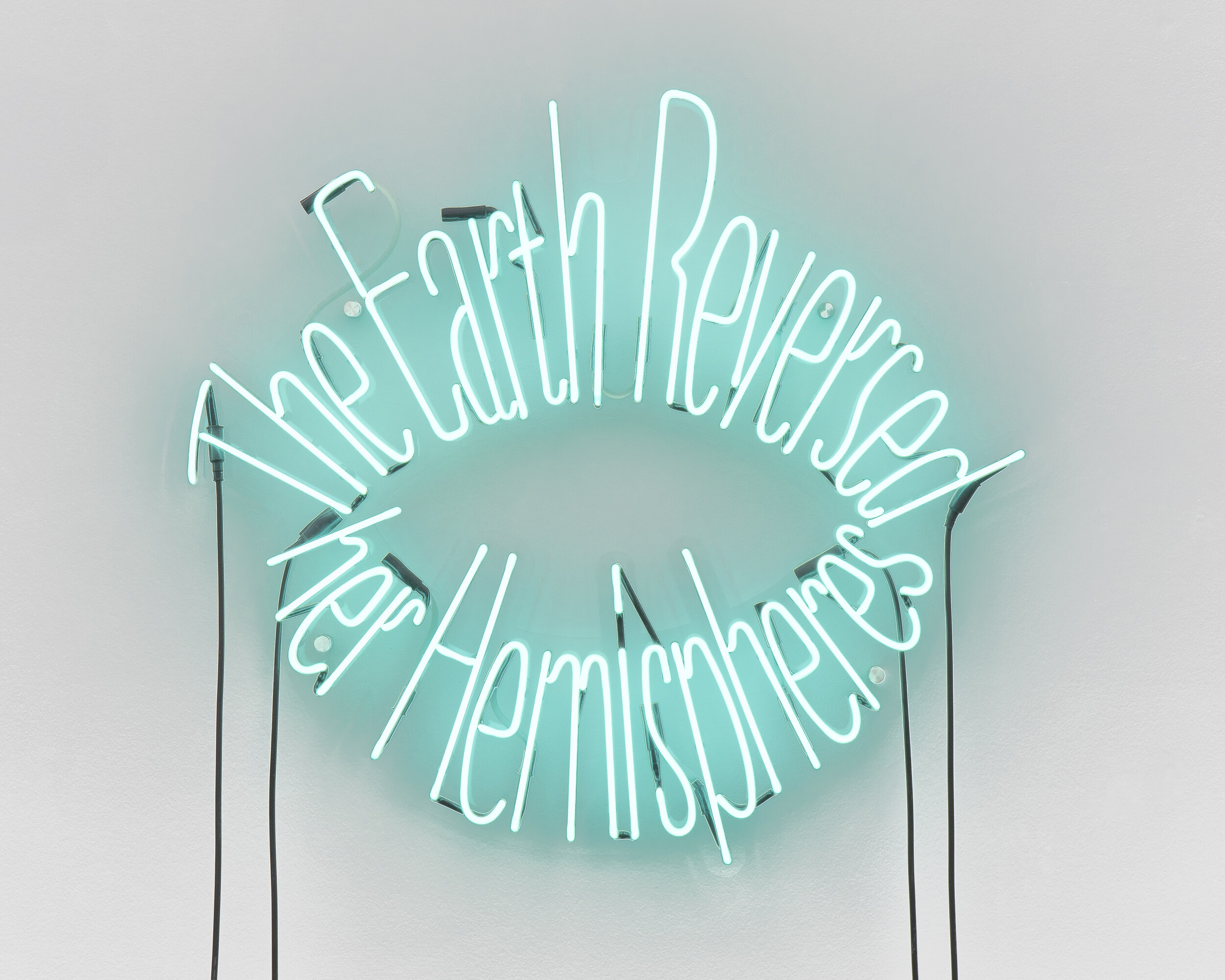 At the end of the gallery, Burchill and McCamley’s aqua blue neon The Earth Reversed her Hemispheres (2024) looks out over the exhibition. It is a reference to a line in Emily Dickinson’s poem 378, I saw no Way—The Heavens were stitched. An earlier version of the work, made in 2021, uses the same stretched lettering of the title as an editioned silkscreen print. As a neon, I am reminded of the scholar Jane Donahue Eberwein’s point: that Dickinson is constantly seeing life as a circuit or a circle. Here, her words are caught in a loop—much like the constraints Dickinson may have experienced within the narrow confines of the church life she was raised in, but also her deeper preoccupation with scientific metaphors, repetition, circular thought, and the cyclical nature between death and renewal.