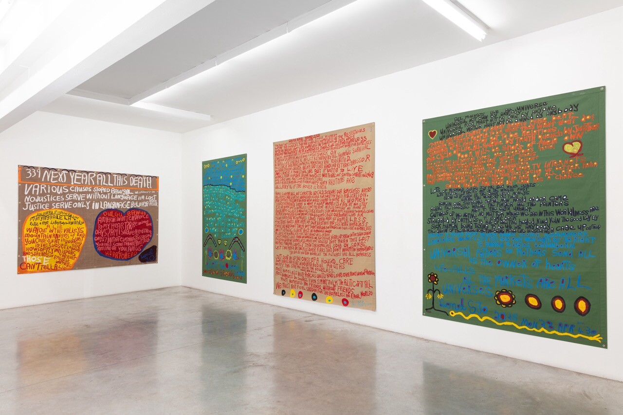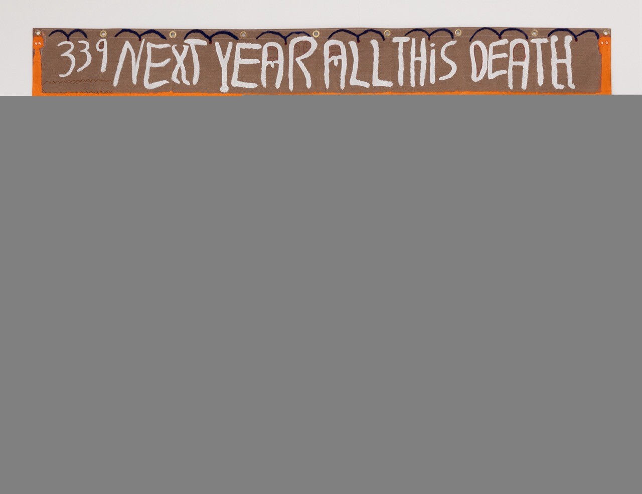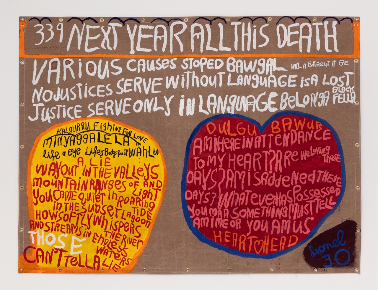In Burraloupoo there are clear signs of Bell and Hookey’s influence, as in 339 Next Year All These Deaths (2023). Directly referencing the 339 recommendations of the 1991 The Royal Commission into Aboriginal Deaths in Custody in its title, 339 acts as a poignant reminder of the persistently atrocious rates of incarceration and death amongst Indigenous Australians under state care. As a text-based artistic response to this issue Fogarty’s work immediately recalls the recent success of Archie Moore’s Kith and Kin (2024), winner of the Golden Lion at the 60th Venice Biennale. However, whilst Moore’s work adopted a research-based approach that spatialised data in order to create an expansive monument to Indigenous victims of the Australian carceral system, Fogarty’s work stages a more direct form of address. In its painted form, the poem becomes a protest banner. The anger that was so carefully sublimated in Moore’s solemn monument is unleashed as Fogarty injects his subjectivity into the work.