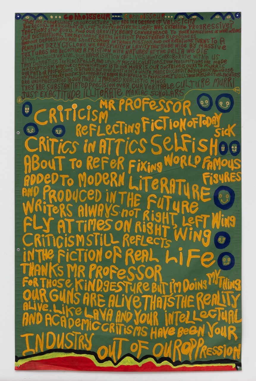 Taken as a whole, Burraloupoo enacts a powerful destabilisation and repurposing of the English language, one that both continues his existing poetic practice, and pushes it into a new field of possibilities. Fogarty’s paintings put aside the formal structure of the page that poetry is all too often forced to conform to, denying a colonial mastering of English and instead forcing the viewer to read on his terms. His highly idiosyncratic creole escapes from the white-reader-as-editor that seeks to “correct” divergent uses of language. Instead it stages a grammatical spin on Glissant’s “right to opacity.” As Connoisseur (2023) states, “Our communications is to our Murris, … your intellectual and academic criticisms have been your industry out of our oppression.” Fogarty’s poetry is in a book where you can read it. Fogarty’s paintings show why this is not enough.