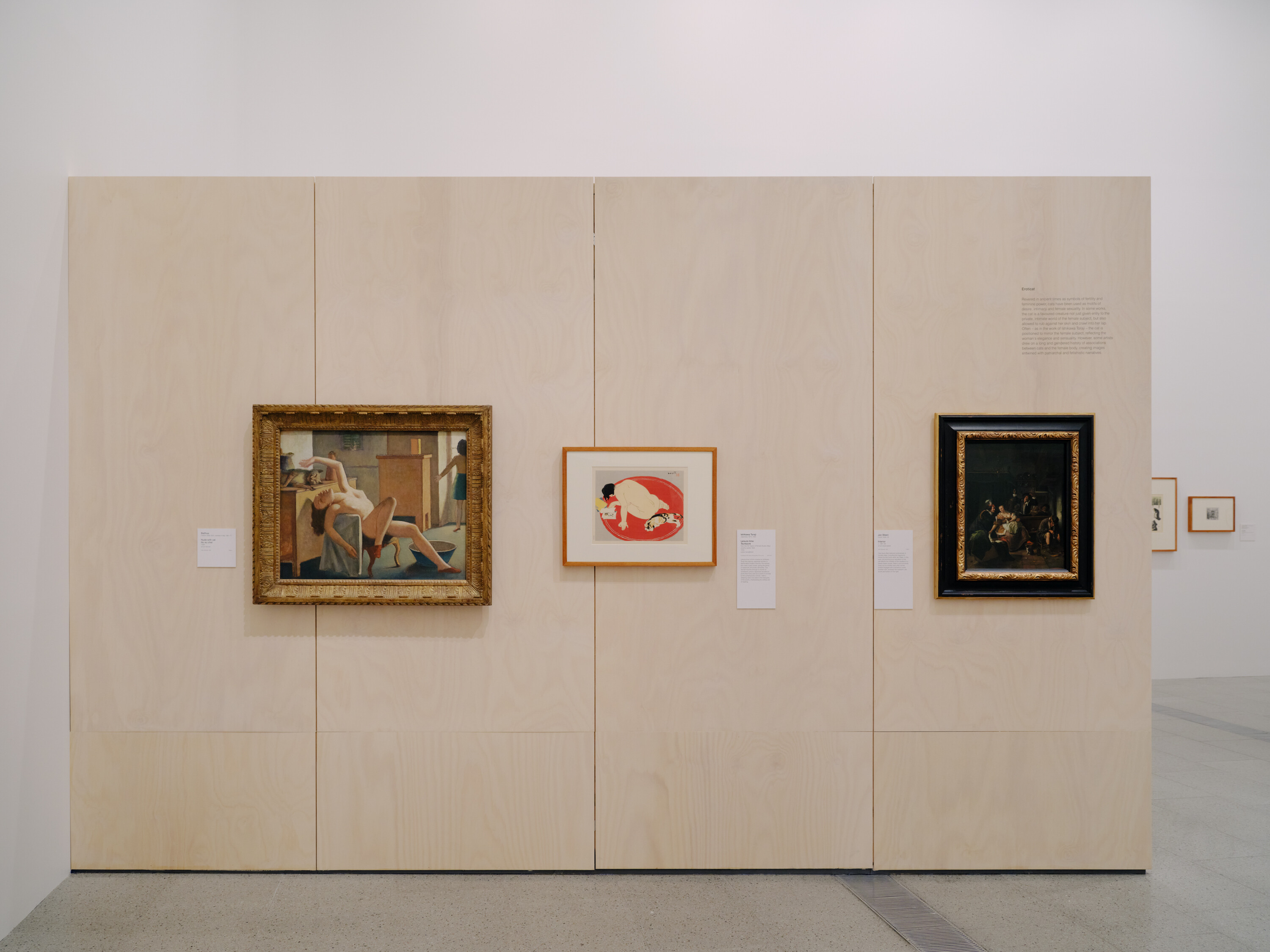 Some artworks are displayed next to one another that are culturally and stylistically different in extremis. For example, under the thematic ‘Eroticat,’ Ishikawa Toraji’s Leisure Time (Tsurezure) (1934) sits adjacent to Jan Steen’s Interior (c. 1661-65). The former is a chic modern Japanese woodblock print of a nude woman lounging on a flat, red disc of carpet, reading a book in the company of a sleepy tabby. The latter is a Dutch genre painting set in a dank, dark room full of jovial, pink-faced beer-sloshers and one cat. In the centre of the painting, a woman’s fleshy tits are erupting from her dress, being suckled by a child on one side and groped by a cad in a feather hat on the other. Leisure Time presents pared-back feminine sensuality; Interior is all gouty Golden Age moralism. These artworks are both exemplars of their type—but are from parallel universes. The presence of cats and nudity in both is perhaps not reason enough to justify their proximity. This being said, it can be a relief to go from Versailles lap dogs to Alice Springs camp dogs.