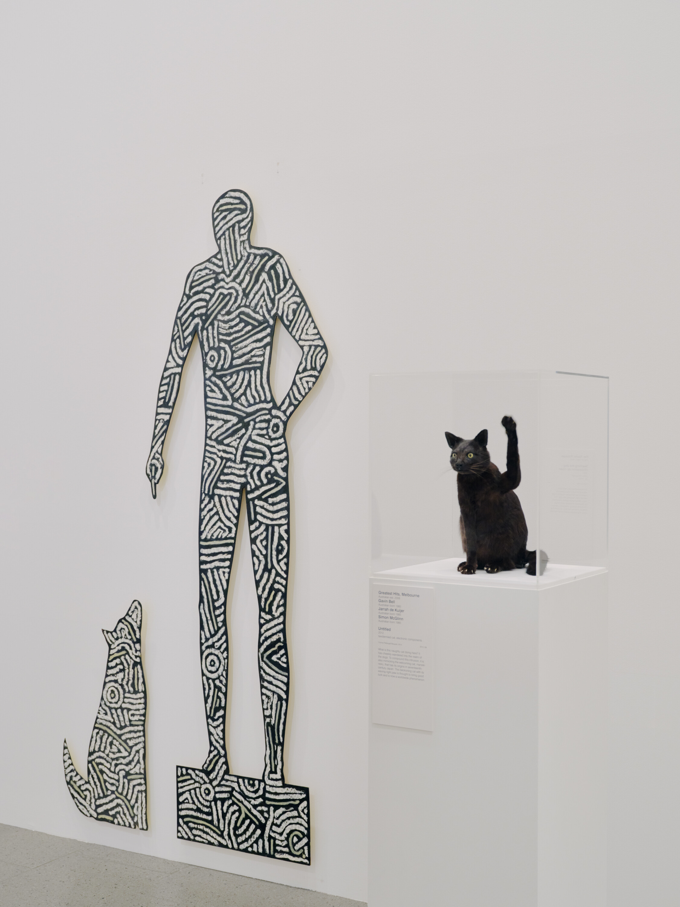 The show is organised around twenty jaunty themes, such as ‘Bad kitty’ and ‘Bad dog, no!’ Every work included is from the NGV’s collection, and as a whole, they share few historical, material, or aesthetic links—aside from representing cats or dogs. There are films, linocuts, ceramics, and one example of moderately disturbing taxidermy. There is Art Nouveau, Art Deco, ASMR, and Tibetan divination. Celebrated local and international artists Garry Namponen, Pierre Bonnard, Grace Cossington Smith, Hulda Guzmán, Lionel Lindsay, and Jeff Koons all make an appearance. There is something here for everyone—and no one in particular.