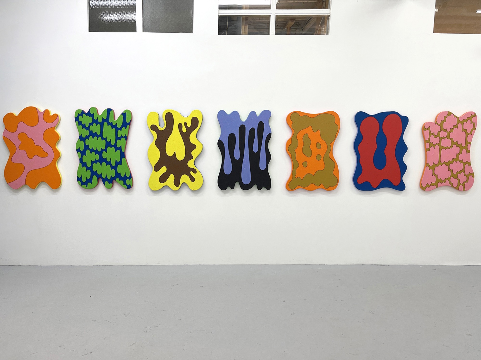 A series of seven shaped panels hold sticky nostalgic sentiments that line the opposing wall. Their colour palettes remind me of all things Nickelodeon dump slime, the covers of R. L. Stine’s children’s horror fiction novels Goosebumps, and even the sign of an independent DVD rental store I use to work at in my early twenties. I call this wobbly-edge abstraction: a product of the warped frames and the mixing of acrylic paint with Harris’ own hair. Up-close, the panels’ surfaces conjure up a sickly feeling of watching someone paint carpet or an image of a hairy leg covered in a thick strip of wax. At first it’s confusing as the installation photographs of these works make them look like they are smooth, ‘clean’, or even squishy. They are still fun, enticing, to ogle and even buy, but their abject production interrupts these innocent initial meanderings.