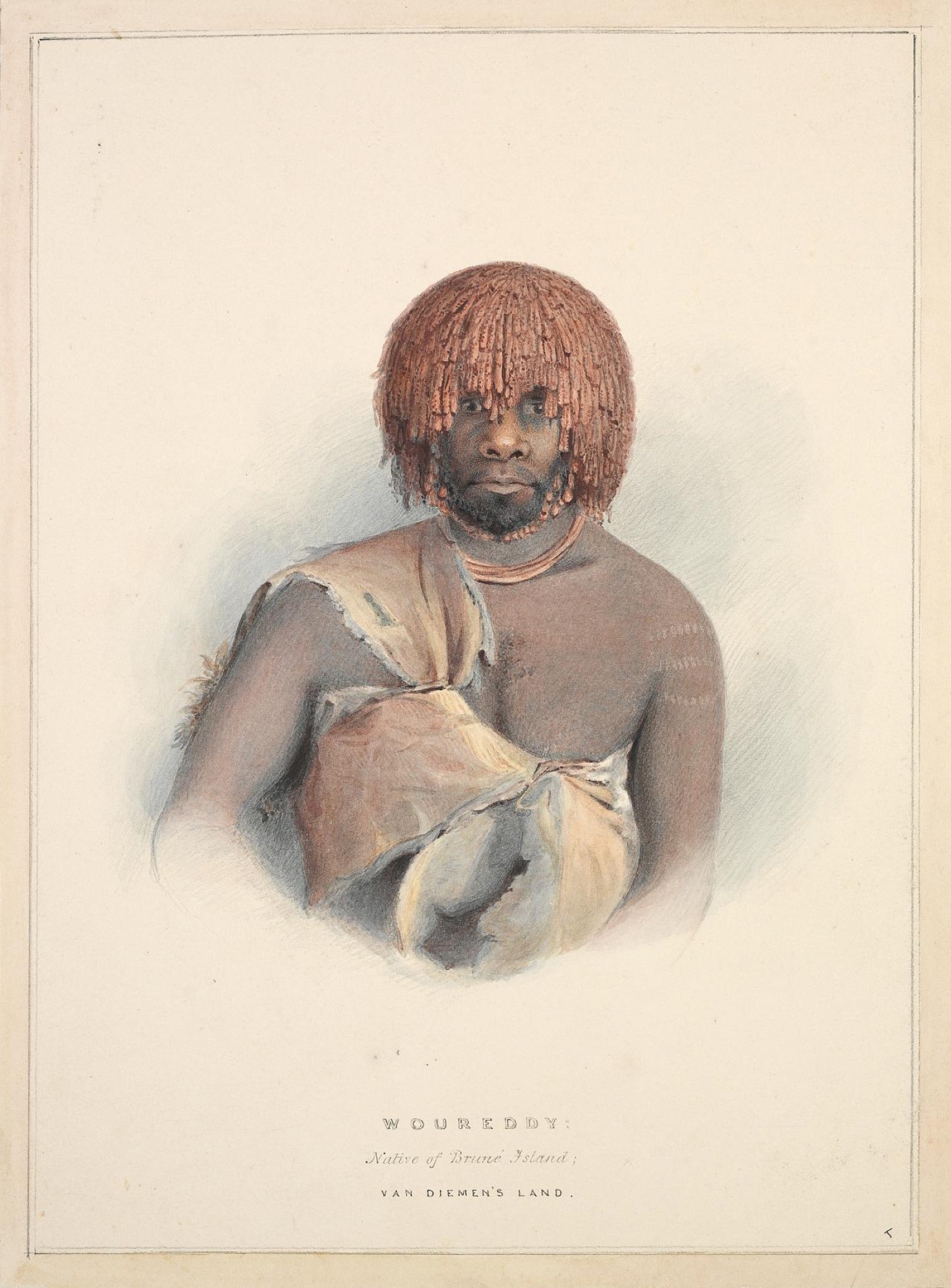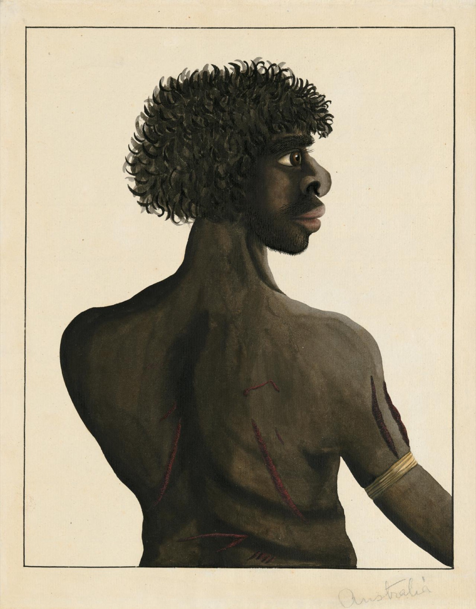 A show like Colony: Australia 1770–1861 in trying to tell the story of the early colonisation of Australia is bedevilled, of course, by the lack of Indigenous voices speaking for the other side. Put simply, the exhibition has relatively few material objects from the time by Indigenous Australians that count as works of art or even documents of social history that would narrate events from their perspective. This is the great difficulty in constructing a new story of Australia when there are virtually no recorded Indigenous voices to help testify. It is perhaps in this regard that that real innovation of Colony can be seen and the first steps in a new museology be understood to be taken. There is the usual – but crucial and comprehensive – range of images of Indigenous subjects, moving from early depictions where they are compared to local fauna through to more “sensitive” renderings by the likes of Charles Rodius and the first known photographs of Aboriginal people by Douglas Kilburn in 1847 (and, notably, to the extent possible the curators of Colony have sought to identify the subjects of these depictions and not have them as the usual anonymous “unidentified”). This exercise concludes with the curators’ coup of hanging Augustus Earle’s well-known portrait of Aboriginal leader Bungaree in red naval jacket and cocked hat across from his portraits of Captain John Piper and family, where it is hard to say who embodies and who parodies emerging colonial values.