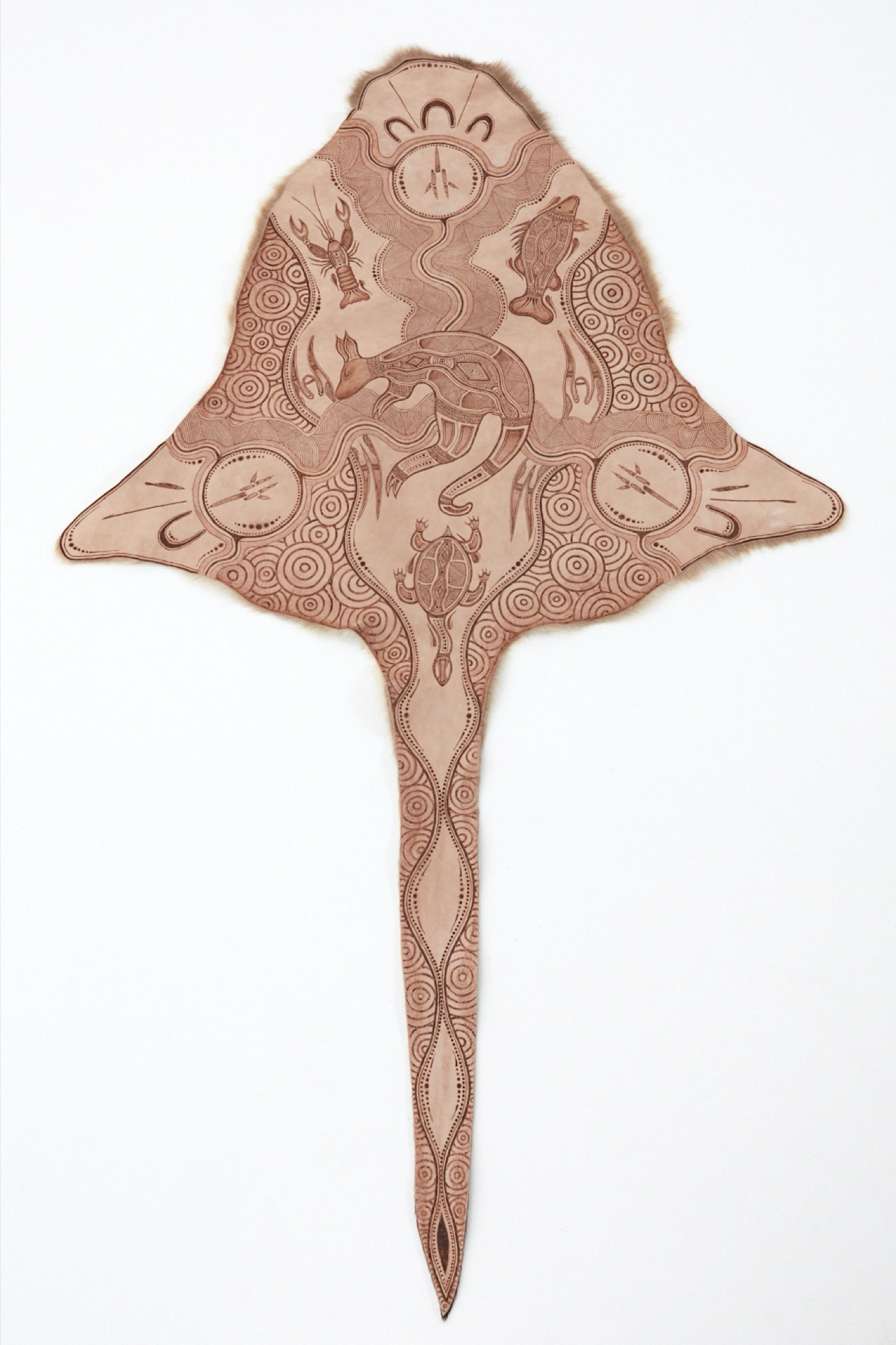 In addition to paintings, we find in the Belongings and Waterways gallery a range of other media too: kangaroo skins embellished with poker designs by Barkindji man Trevor and Gundijtmara man Christopher Pillgram; painted or poker-worked boomerangs, shields and yidaki; a suite of plinths displaying finely woven baskets, including Torres Strait Islander Sonia’s raffia basket titled Near the End of My Journey (2019), created as the end of her sentence approaches; and a series of four finely patterned silk scarves made by Gundijtmara woman Lodi Lovett, which have been created using natural dyes extracted from locally sourced eucalyptus leaves amongst other plant materials, such as onion skins.