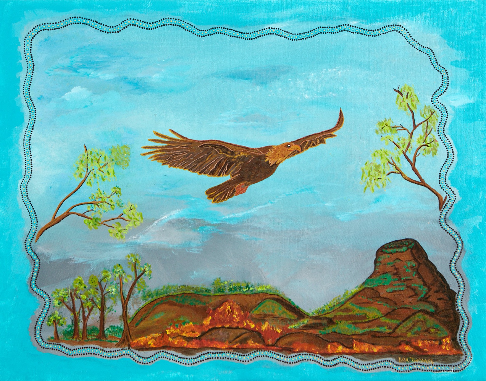Another wall is hung with paintings grouped around earthy orange-brown tones. Here, Christopher Austin (Gunditjmara Keerraaywoorrong people) presents Our Changing Climate (2020)—an aerial view of a turtle walking up a dry river bed. The river bed is so parched that it’s riven with cracks that emulate the scutes of the turtle’s shell, creating a fractal-like continuity between animal and land. The artist explains: “This is the sad result of human greed and pollution changing our climate”, highlighting the profound damage wrought by centuries of non-Indigenous governments and corporations neglecting obligations to care for Country. Just last week, on the Western flank of the Australian mainland, Rio Tinto blew up a 46,000-year-old Aboriginal heritage site at Juukan Gorge in the Hammersley Ranges in order to expand its iron ore mine, then offered a limp apology to its original custodians, the Puutu Kunti Kurrama and Pinikura People. In March, while the Victorian population was overwhelmed with the coronavirus crisis, the Andrews government passed a law allowing onshore gas exploration from July 2021.