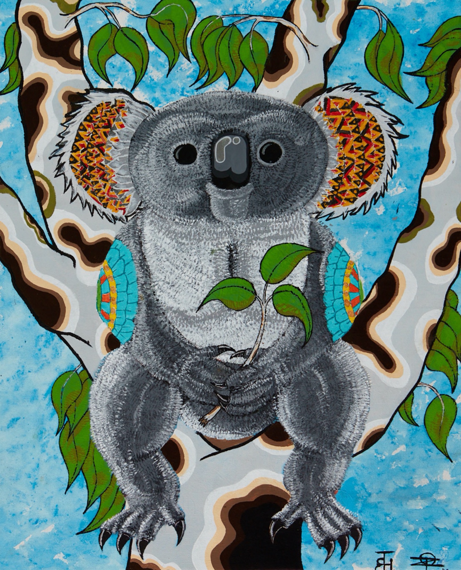 Confined 11 does not critique the carceral complex, per se, or at least not directly. One of The Torch’s taglines is: “By embracing participants as artists rather than ex-offenders The Torch provides an avenue for change.” In downplaying the “prisoner” to make way for the “artist”, the framing of the exhibition in some ways trades off a structural critique of the criminal justice system to, very practically and understandably, foreground themes of positivity, courage, hope and future, as well as make immediate pathways for Torch artists into better lives. The exhibition’s lost opportunity, however, is the possibility of collectively articulating justice from an incarcerated perspective—an understanding of which, to again quote Fleetwood, is deeply troubled by “aesthetic practices that emerge from, not despite, systems of punishment”. An artwork that has recently come up for sale on The Torch website by Flick Chafer-Smith (Ngarrindjeri people) articulates this complexity with commanding economy. The new work is very different in colour palate and subject matter to the artist’s painting New Life, included in Confined 11, which depicts a silhouetted koala in a tree against a brightly coloured, Op Art–like backdrop of zigzags. Her new painting Black Bodies Behind Bars (2020) comprises a black monochrome backdrop against which four pairs of black, disembodied hands grip vertical grey bars, evocative of a prison lock up. The bars, however, are embellished with concentric diamond patterns, and may thus also be read as spears—instruments of war, hunting, justice and culture. The work documents Indigenous dispossession of, then imprisonment on, Indigenous land. In the artist’s words, it depicts ”the over-representation of our people in jails”. And in so doing, this painting carries within it (not unlike the seed heads in Veronica Mungaloon Hudson’s bushfire painting) both a glaring assessment of the system and the tools with which to fight it.