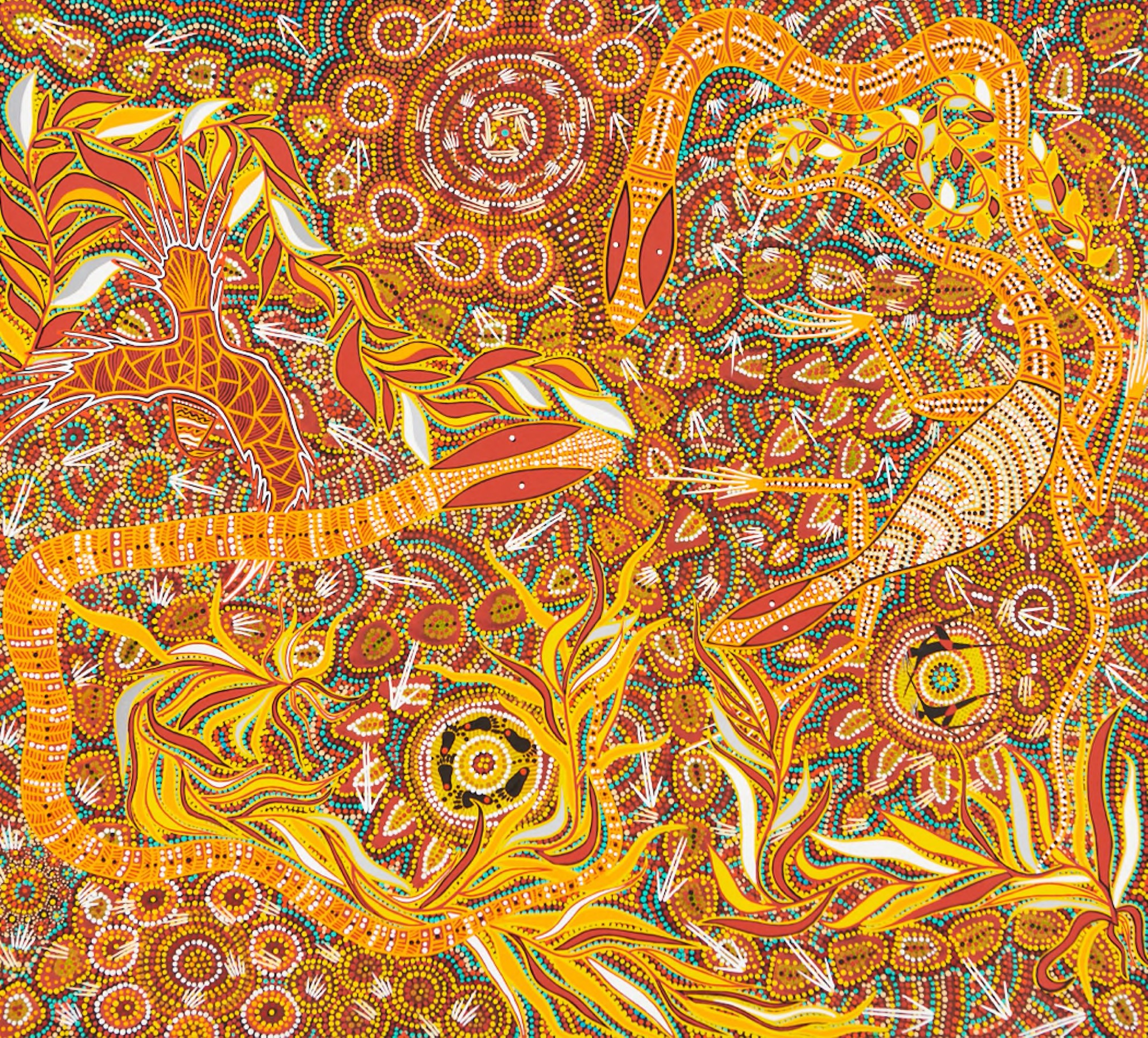 It is, however, the Birds, Bushfires and Country gallery that holds some of the most resonant contemporary artworks. Gary Reid’s (Pitjantjatjara/Yankuntjatjara) Waru Pulka/Bush Fire (2020) is a swirling haze of bright yellow, orange and ochre-coloured lines and dots that describe snakes, leaves, lizards and footprints—shot through with the tiniest glimmers of sky-blue pigment. Veronica Mungaloon Hudson’s (Pitjantjatjara) Burning of the Land #30 (2020) references Indigenous land management practices of burning to make way for new growth. As Hudson explains in her statement, she used grasses and branches to create the rising flickers of colour, leaving some of the seed heads and grasses embedded in the pigment itself—a symbolic and literal promise of new life after the flames.