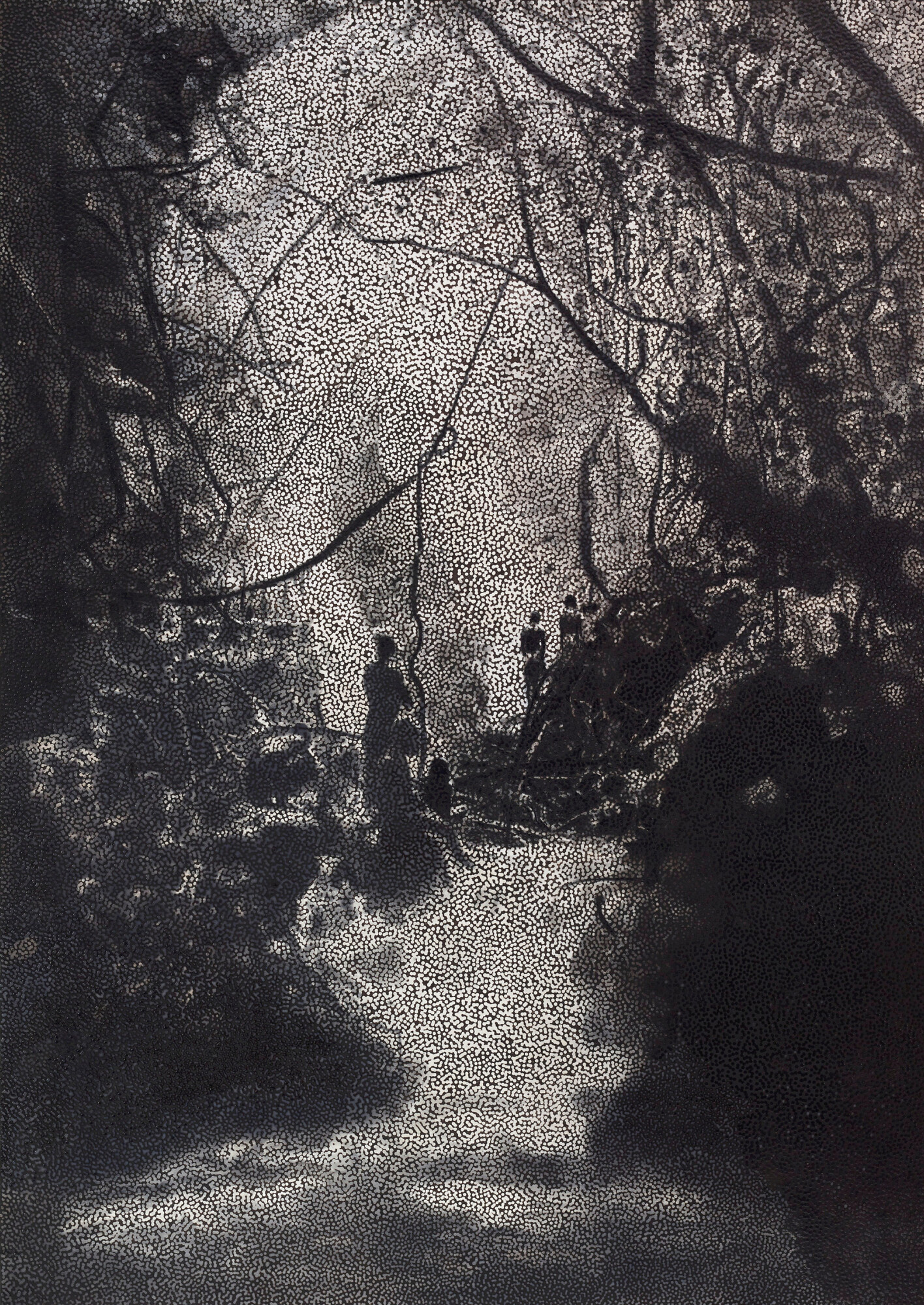 Where First Nations peoples’ tangible and intangible intellectual and cultural properties have become assets of cultural institutions, accounts of First Nations peoples’ involvement in these networks of collections histories have largely been relegated to being assistants to the collectors, curators, and anthropologists rather than performing these roles themselves. Boyd often singles out these actors of historical agency, magnifying but also obscuring their comprehension. His painting methodology refuses the ready access and availability of the source material Boyd uses.