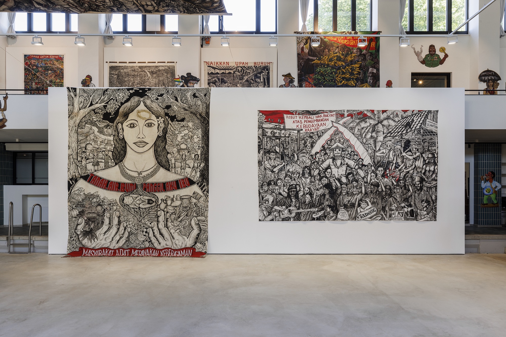 ruangrupa has based documenta fifteen on the idea of “lumbung”, which directly translates as “rice barn”, and refers to a communal building where a community’s harvest is gathered and distributed as a collective resource. Fourteen collectives and a handful of individual artists were initially invited by ruangrupa. In the spirit of lumbung, the production budget was then gathered into a shared “pot” and distributed according to a collective decision-making system based on ten assemblies called majelis. Larger majelis akbar were also held, in which further artistic decisions were made collectively. The lumbung members were empowered to invite additional artists and collectives, resulting in a transnational network of around fifty collectives and 1,500 artists (no one seems to know the exact figure).