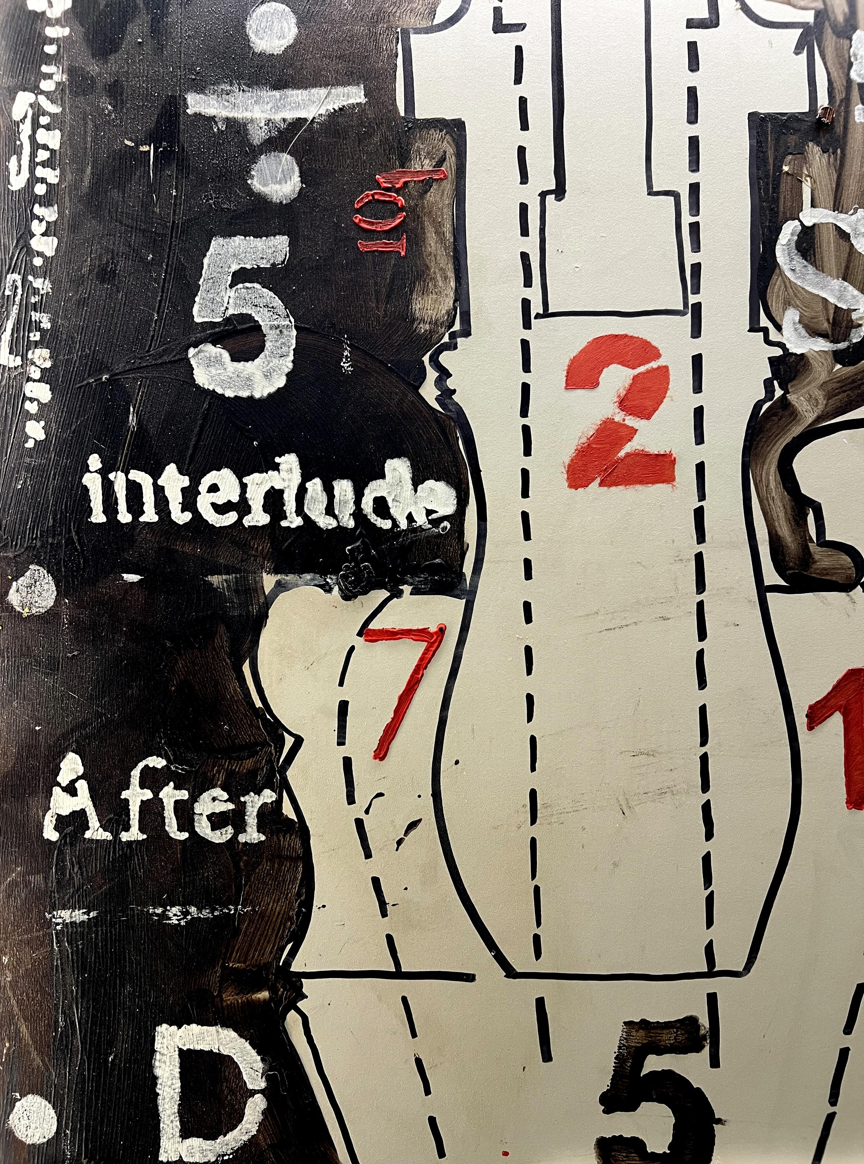 Smith St. C’wood Building Score (1991) is the largest piece in the exhibition, nearly two metres tall. Made in collaboration with artist Eugene Carchesio, the upper section of the picture is a schematic drawing. Its details are distinct, but it echoes, formally, with a wind instrument made of clear and opaque pipes that is leaning against the painting. For me, the wind instrument further consolidates the interwar-ness of Meerten’s work, through its material and formal likeness with the historically anomalous, also hyper-phallic, Dadaist pipework readymade God (1917) by ‘The Baroness’ Elsa von Freytag-Loringhoven. Across the surface of this painting are stencils of seemingly random numbers and letters, yet the title suggests musical notation.
