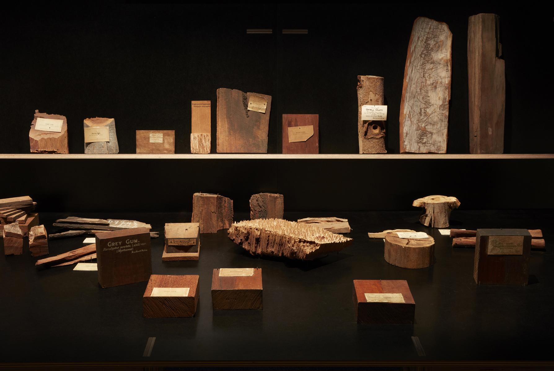 Eucalyptusdom makes good use of the Powerhouse’s significant resources. Occupying almost the entire length of one of the museum’s industrial warehouses, the exhibition includes over 400 objects, which range across a handsome set of display tables specially designed by famed modernist architect Richard Leplastrier, with Adam Hadow and Worimi/Birippai architect Jack Gillmer. These darkly glowing surfaces match perfectly the exhibition’s soft lighting and elegant drapery, transforming the cavernous industrial shed into a close, almost cinematic space.