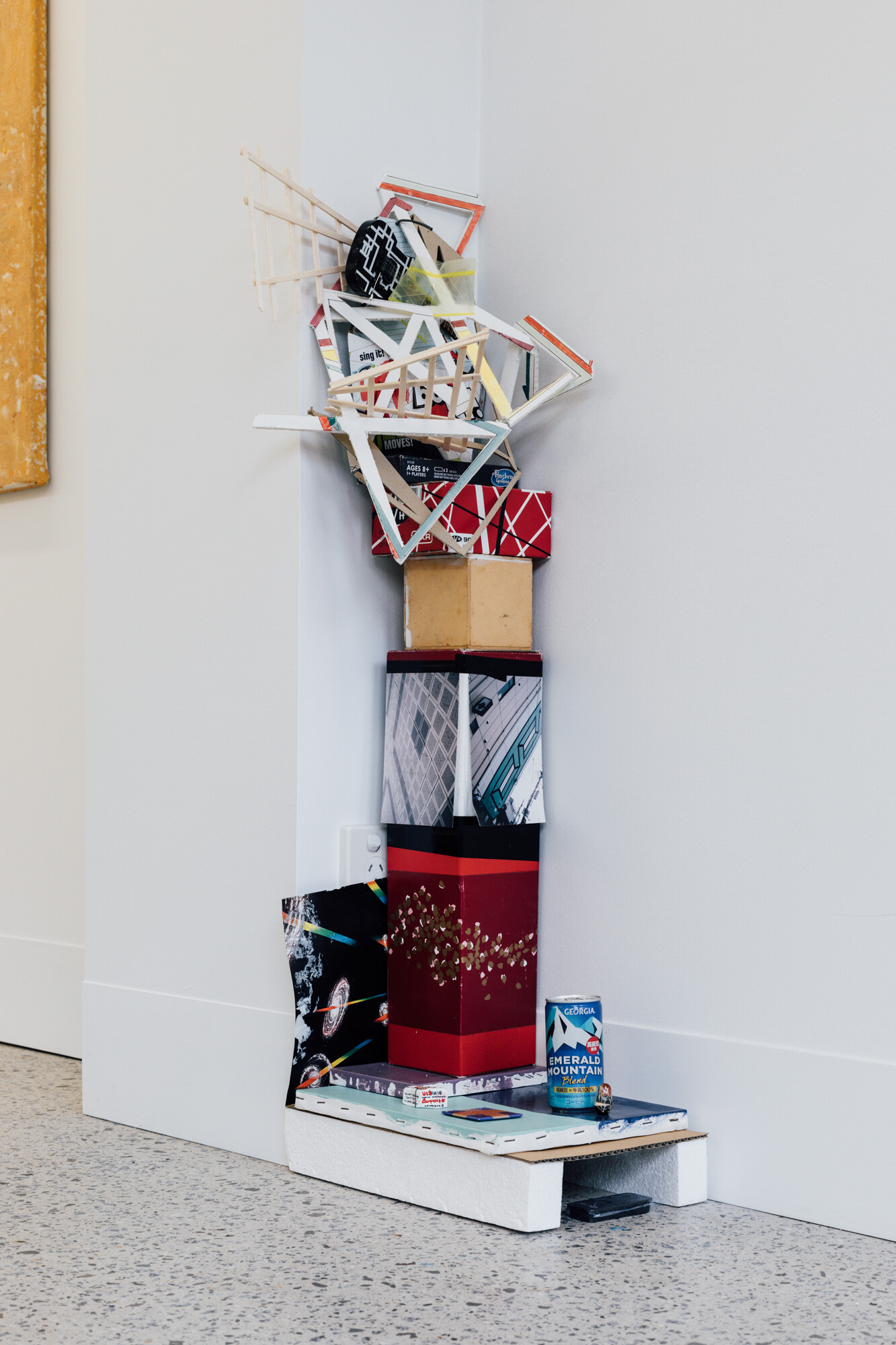 Masato Takasaka, Yet Another Propositional Model for the EVERYTHING ALWAYS ALREADY-MADE STUDIO MASATOTECTURES MUSEUM OF FOUND REFRACTIONS (1999-2024) Yes, You Kant After Duchamp!, 2024, mixed media, enamel and acrylic on canvas, cardboard, foam-core, found objects, self-adhesive vinyl on found packaging, 92 x 35 x 22 cm, photograph: Lauren Dunn.