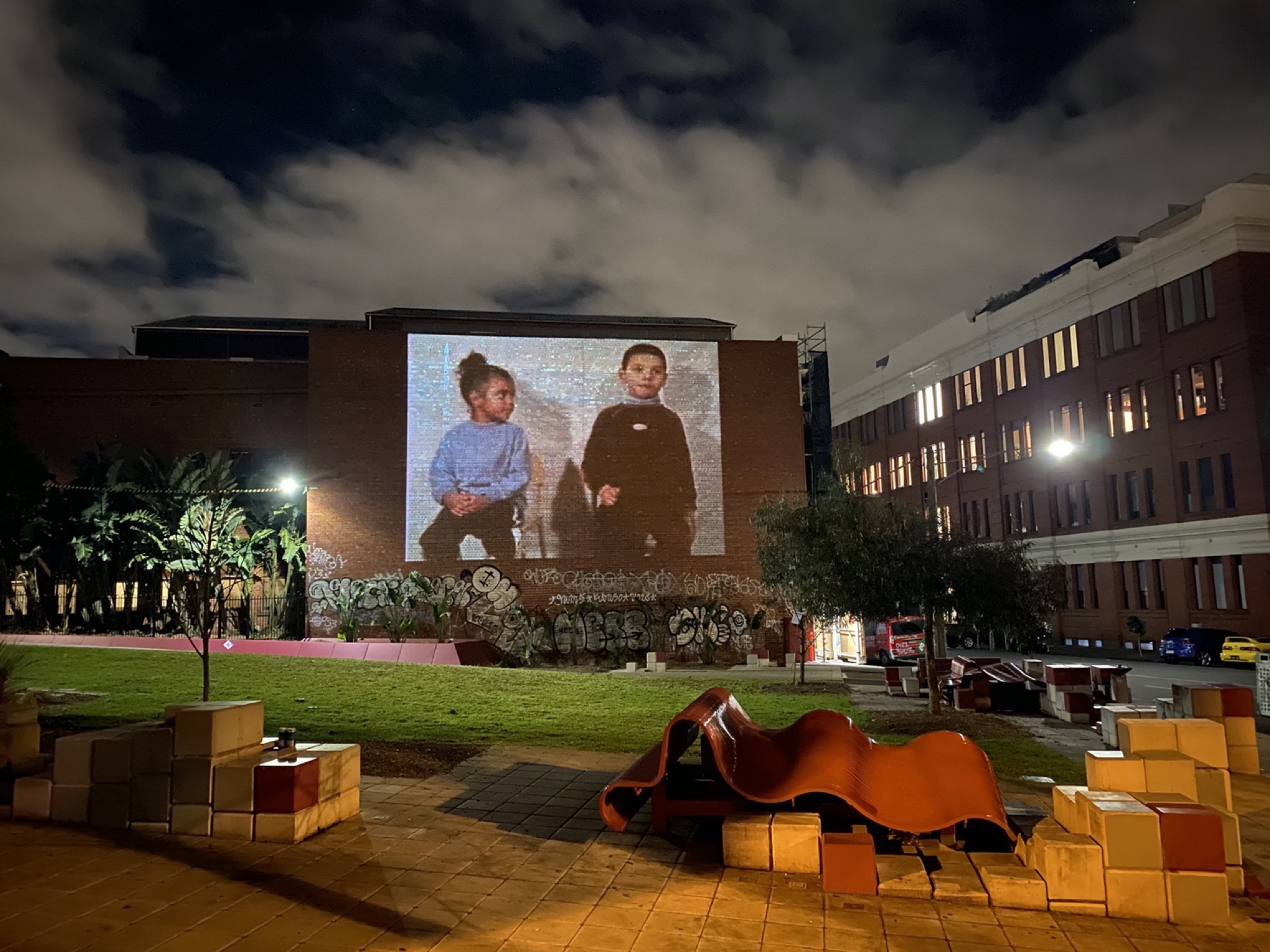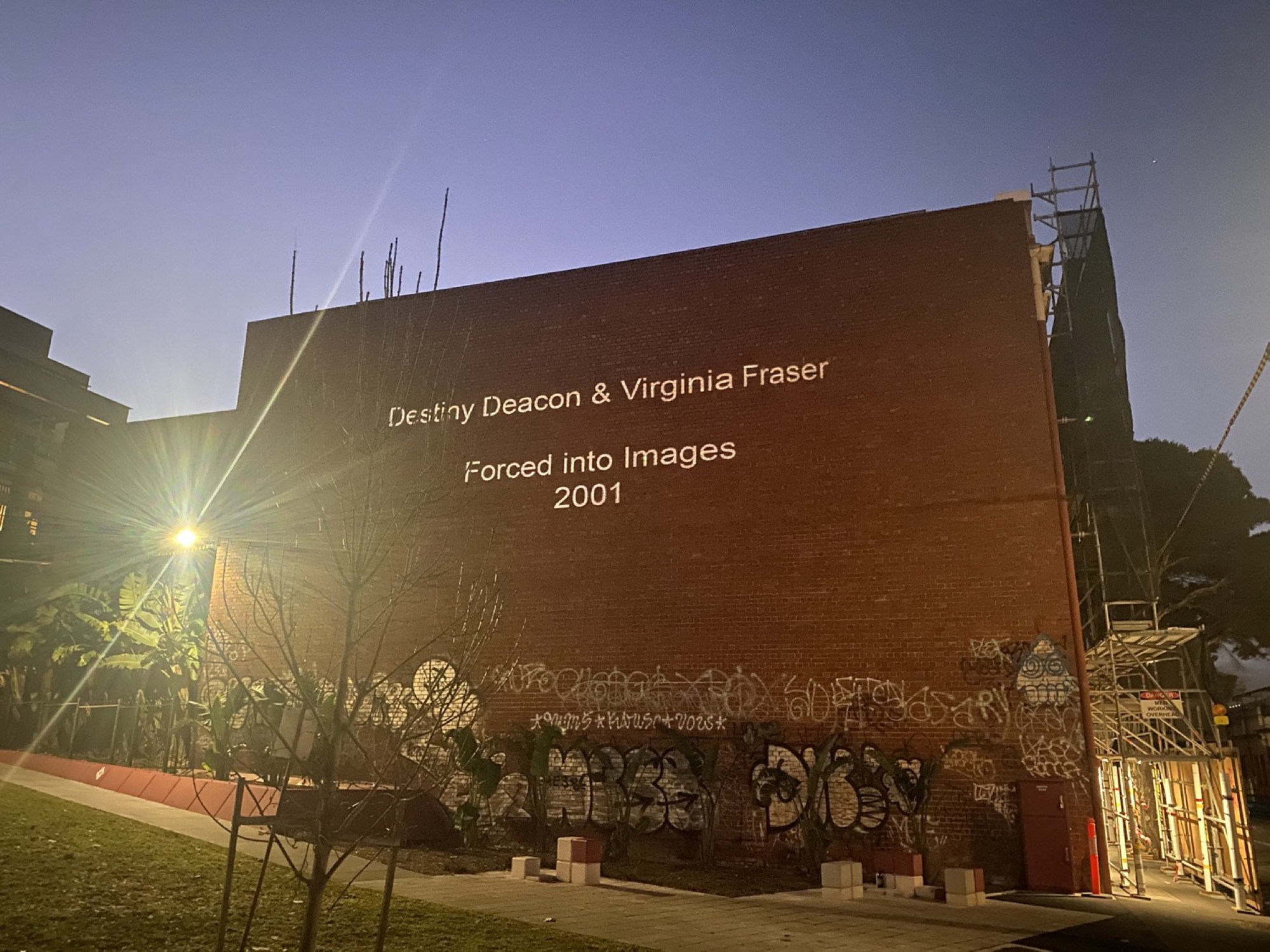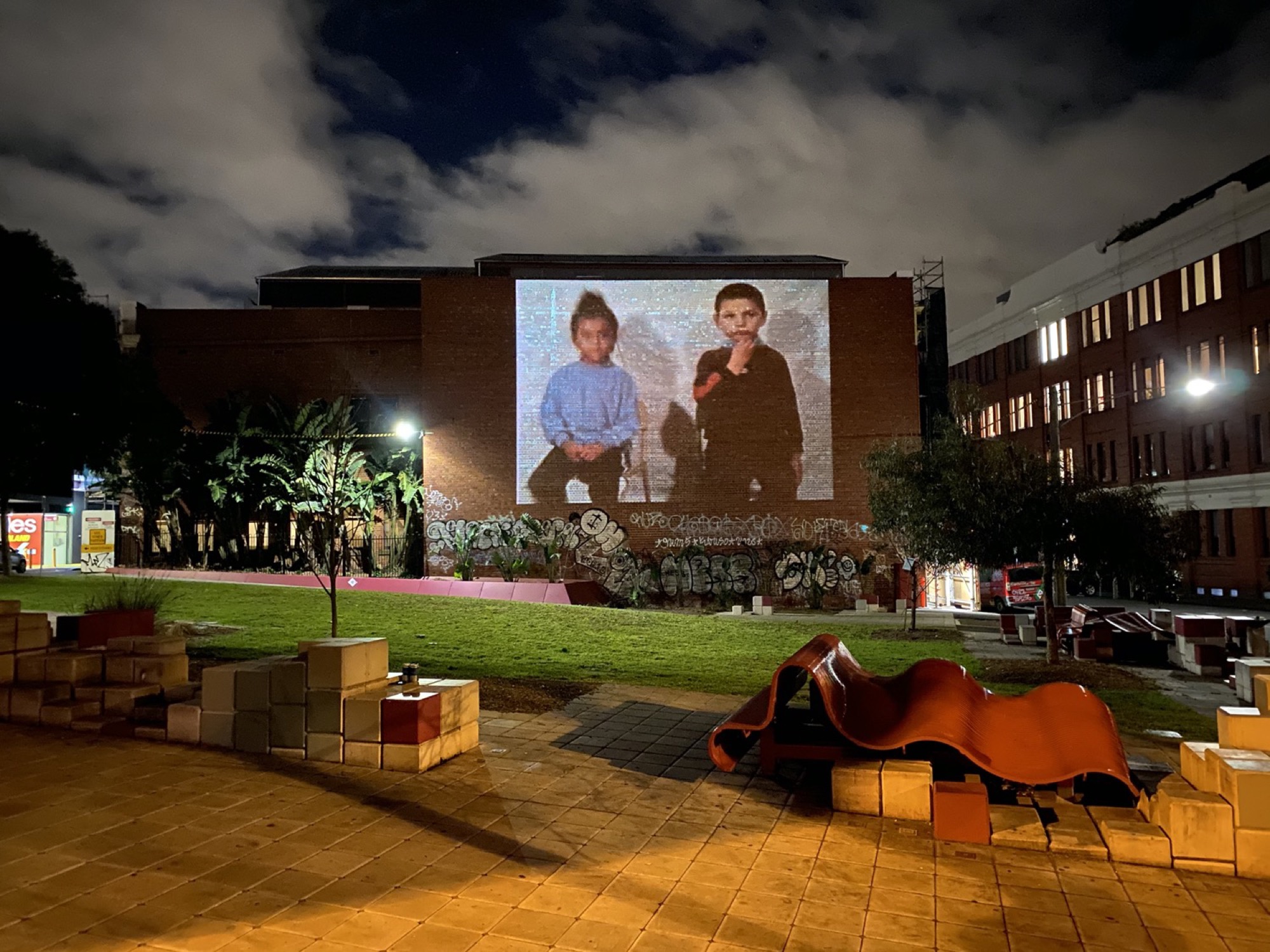 I vividly remember an architect friend pitching a contemporary art version of the Bolshevik agit-train—printing press, movie theatre and complaint office on board, distributing the values and programs of a revolutionary form. In Soviet Russia, this state-based propaganda was delivered to an isolated peasantry. Here in Peel Street I am curious as to the audience—new medium density apartment homes with large uncurtained windows revealing large flat-screen TVs. No longer a signifier of wealth, the televisions are banal black mirrors or ready-to-watch windows. Unperturbed by the projected moving images before me, a couple with their rescued greyhound walk by the tinnies resting on the bespoke social furniture of the park. It is 9.30 pm. This is a different abyss to that examined by Tony Birch in his essay ‘These Children have been Born in an Abyss’. Centring around the hard-to-imagine now early twentieth-century slum of Fitzroy and Collingwood, Birch’s essay examines the myth of photographic truth where the burgeoning technology of photography came to the assistance of the literary slum genre, risqué journalism and the discipline of social science. Both Abu-Lughod and Birch ask what authority documentary images uphold. In stark contrast, Deacon and Fraser’s portrait gives time to time spent and the absurdity of decontextualised gestures, intimacy and image making.