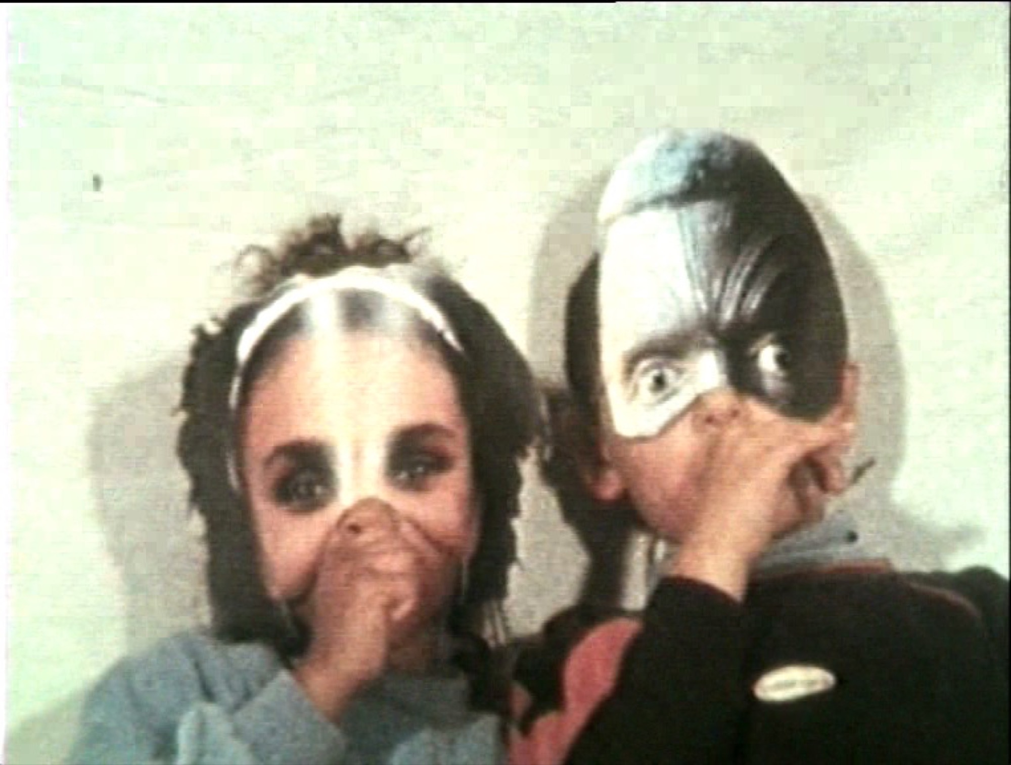 The domesticity, cheekiness and sleight-of-hand humour of Forced into Images subverts this. Deacon and Fraser’s subjects are always waiting. The post-production editing—sped up, slowed down—segments banal horror, silently slurping icy poles. These carefully montaged images do not measure content as perhaps Eadweard Muybridge’s mechanical sequences might. The no-narrative turn sees the kids choosing masks, one for each, local-printshop and home-styled—the innocent become curious disproportionate forms—adult babies, accidental aliens, squashed in time. I remember Barbara Christian in Ethnic Notions reflecting that the way we are imaged influences how we image ourselves.