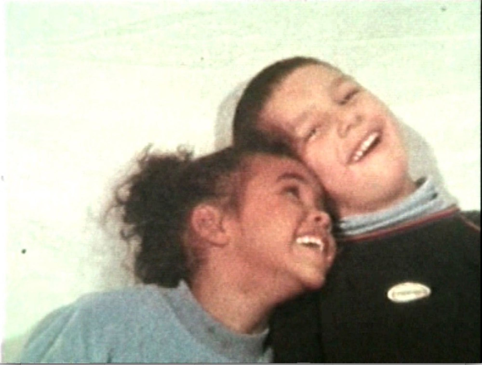 I return to the screen while the young boy, who I imagine to be now in his mid 20s, sneezes. His gesture is copied by his younger female friend, sidekick, sister or cuz—her mimic familiar as form in competitive familial relations. Learnt behaviour, and what do we learn? This film is silent, but its scale seems to sound like “home”. Pitted side-by-side our protagonists look beyond us, to those behind the camera. Responding to cues or simply each other—the performance of a screen test, or perhaps just a test of time.