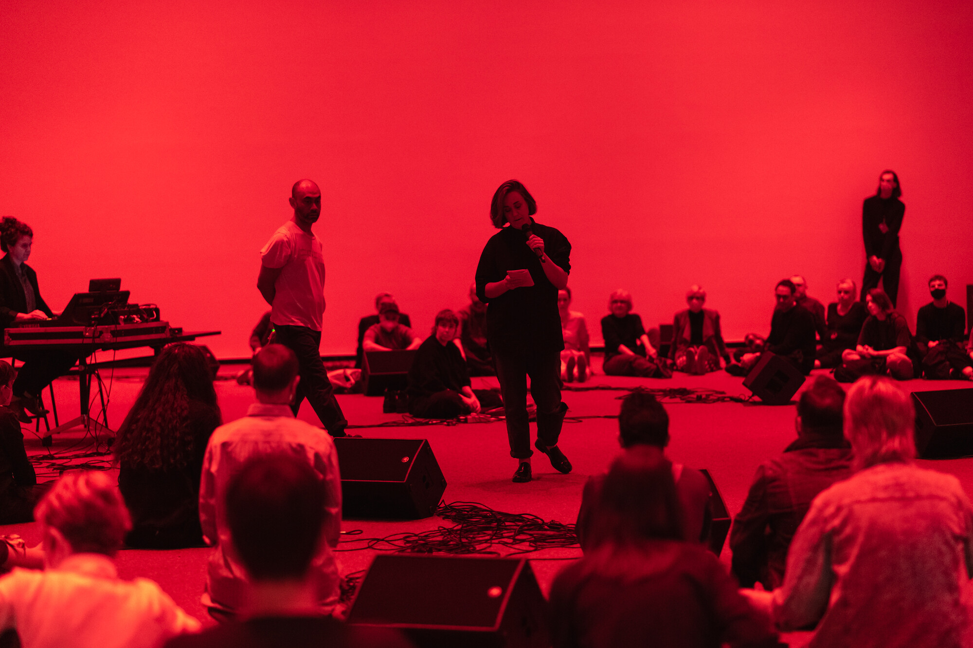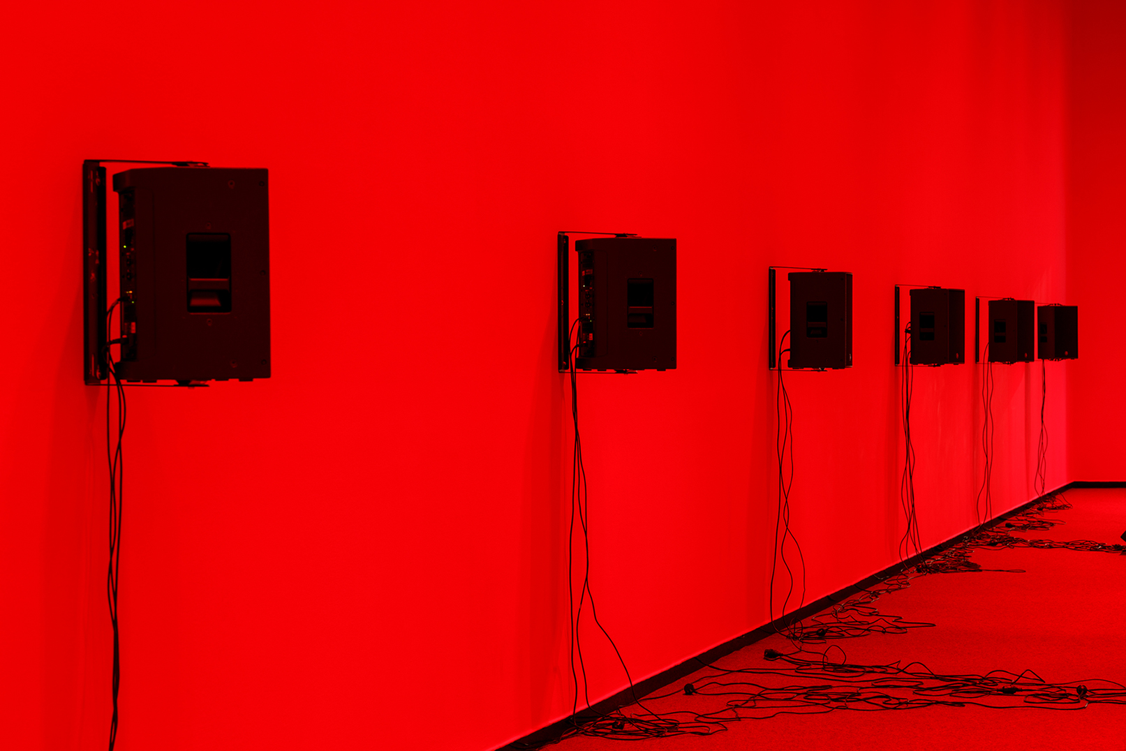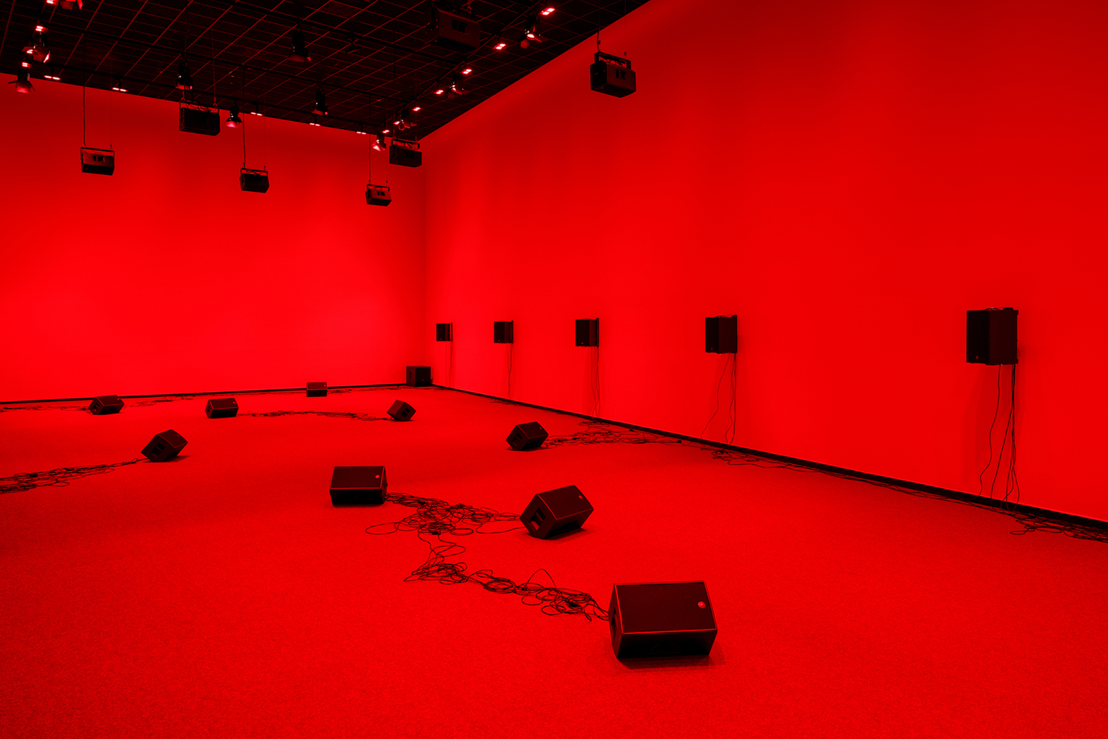 The colour red is pregnant with a range of common signifiers: danger, passion, power, love, sex, anger, violence. Sitting in the large, red-lit gallery space, clocking thirty-one metres in length (slightly bigger than a full-grown blue whale) there is a mixed physical sensation of being lost in the pits of the deepest sea, returned to a maternal womb, or floating inside a stretched-out, oversized red blood vessel. The only objects visible within the space are heavy-looking speakers under the red saturated light, evenly spaced and lining the ceiling and walls with black cables trickling down, along with a handful dotted on the carpeted floor.