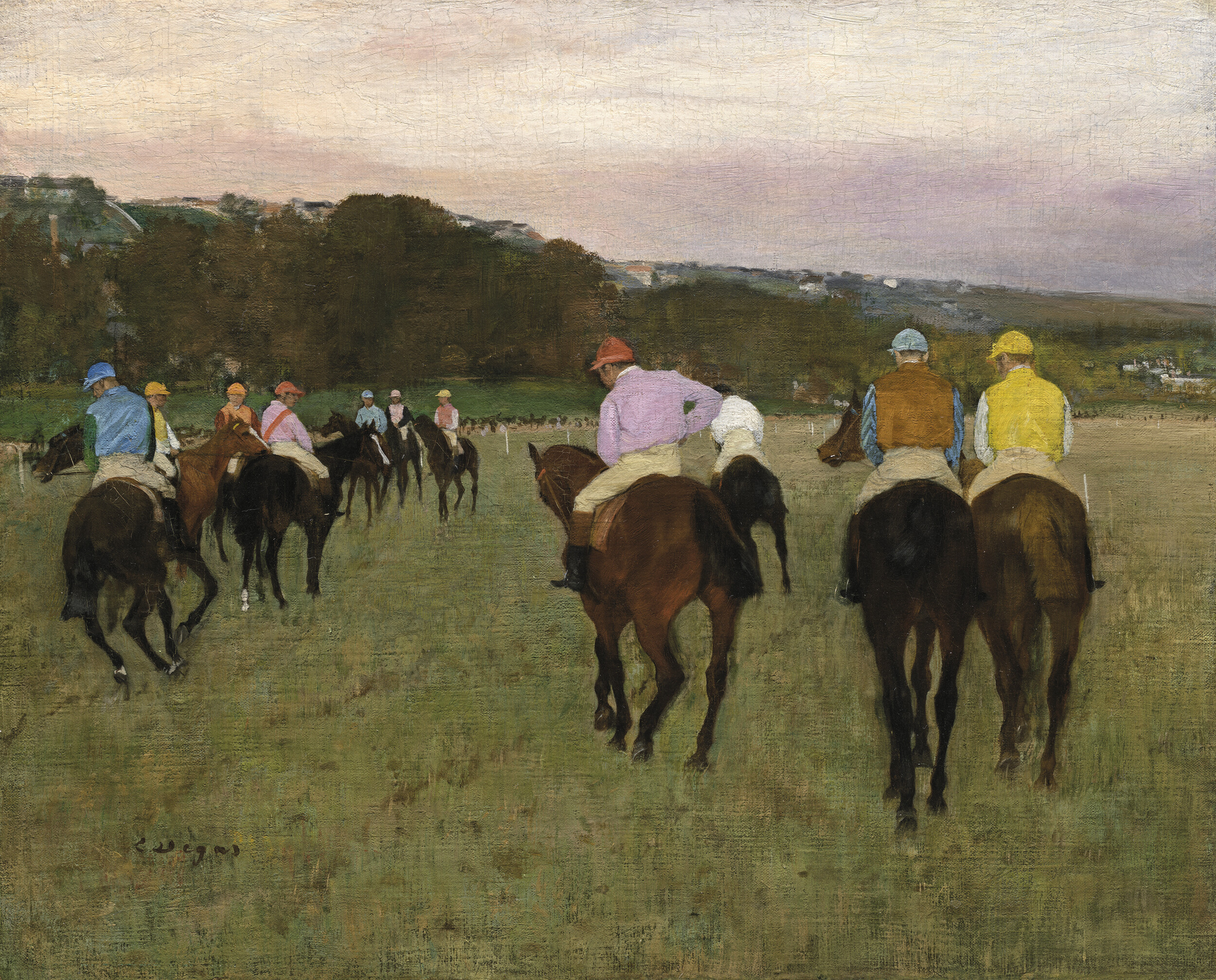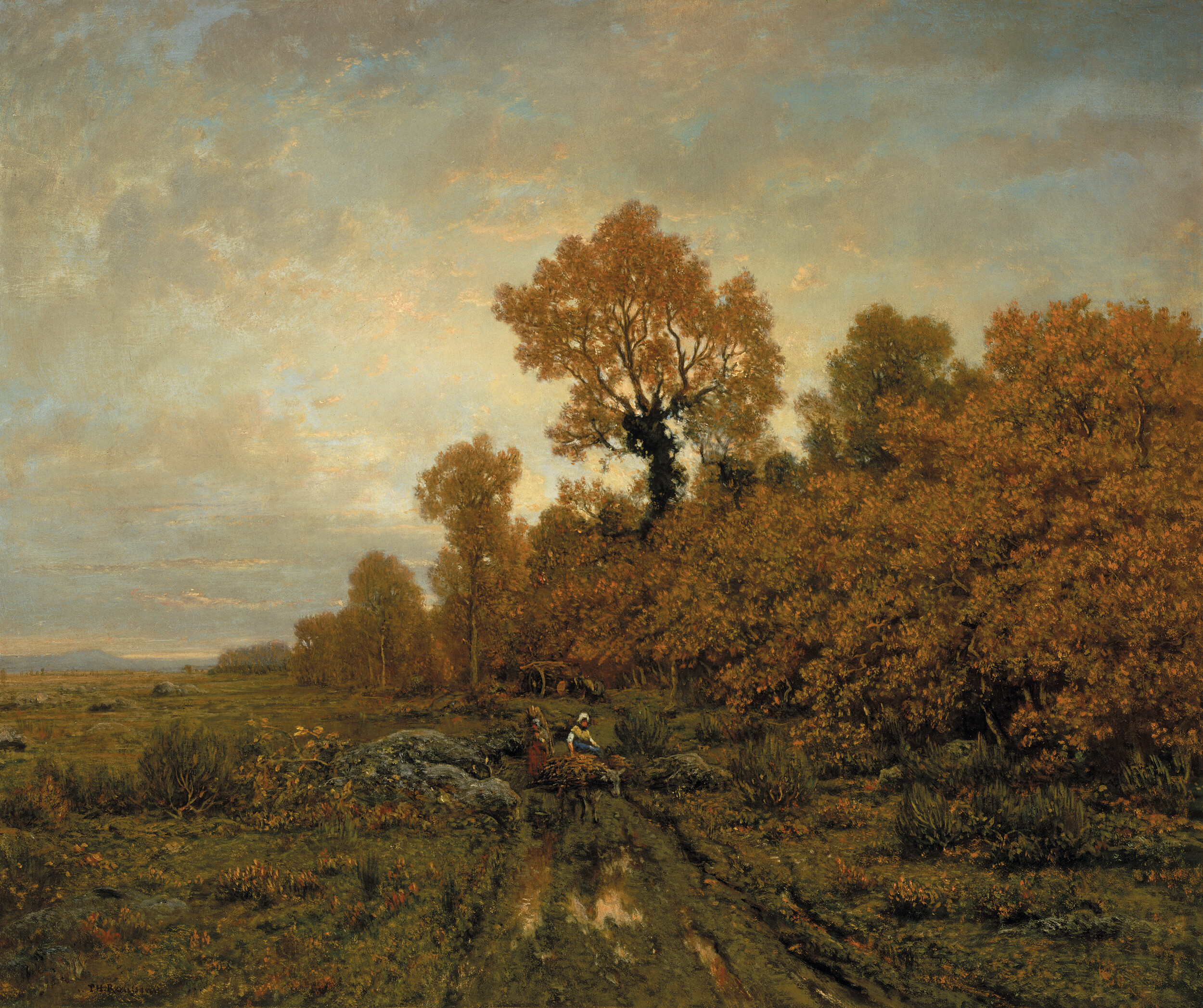 Each room has a different scenography, but each shares a theatrical, Hollywood historicism—all big, beautiful rooms. After opening in the gilded-age’s Boston mise en scène, the immersive pastiche veers into the wooded atmospheres of Barbizon painting. “Before Impressionism” (the Barbizon room) is clad in dark green damask, with mahogany wainscoting, and tasselled drapery, evoking a Second Empire study. These landscape painters were, from the beginning, the old-timers said to inaugurate the plein-air tradition. Unlike the Impressionists, though, Rousseau’s Edge of the Woods is dense and airless, with a sodden track—more trodden than modern—receding into rusted foliage that swallows light and peasantry. These autumnal, depressing impressions are meant to prefigure a good, honest realism and humble truth-telling. Others, like Corot and Millet, exude more of the staged symbolism of the academy. One intriguing picture is Paul Huet’s The Forest of Compiègne (c. 1830), consisting of five forest vignettes on a single small canvas. Predating 1841’s wide availability of tubed paints it suggests a painter still tethered to the studio, grasping at the open air with rushed studies.