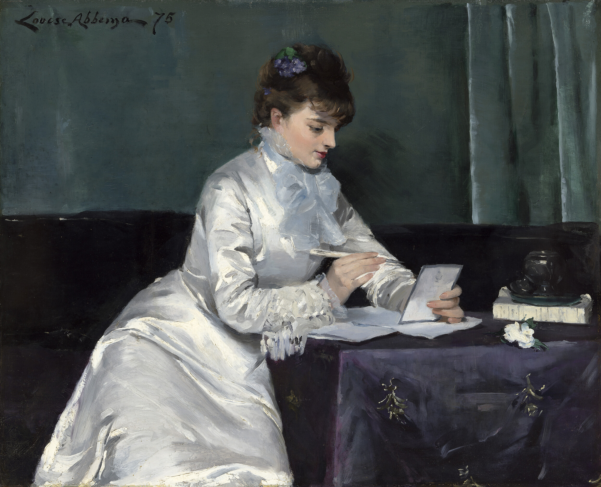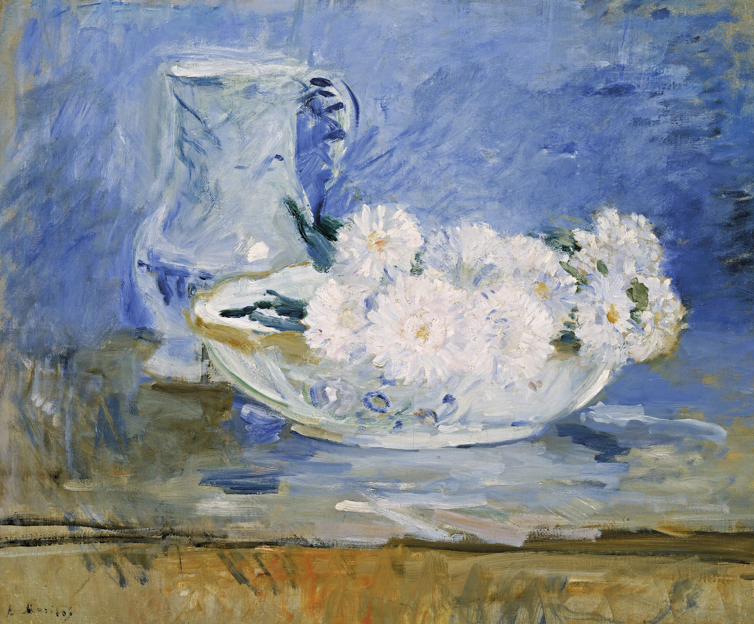 When history arrives, it appears rather as hints or flashes—impressions, if I may. Courbet’s Hollyhocks in a Copper Bowl, for instance, hangs in the studio room like a soft, flowery bruise. It was painted in 1872 while the artist was imprisoned for his role in the Paris Commune and the toppling of the Vendôme Column.