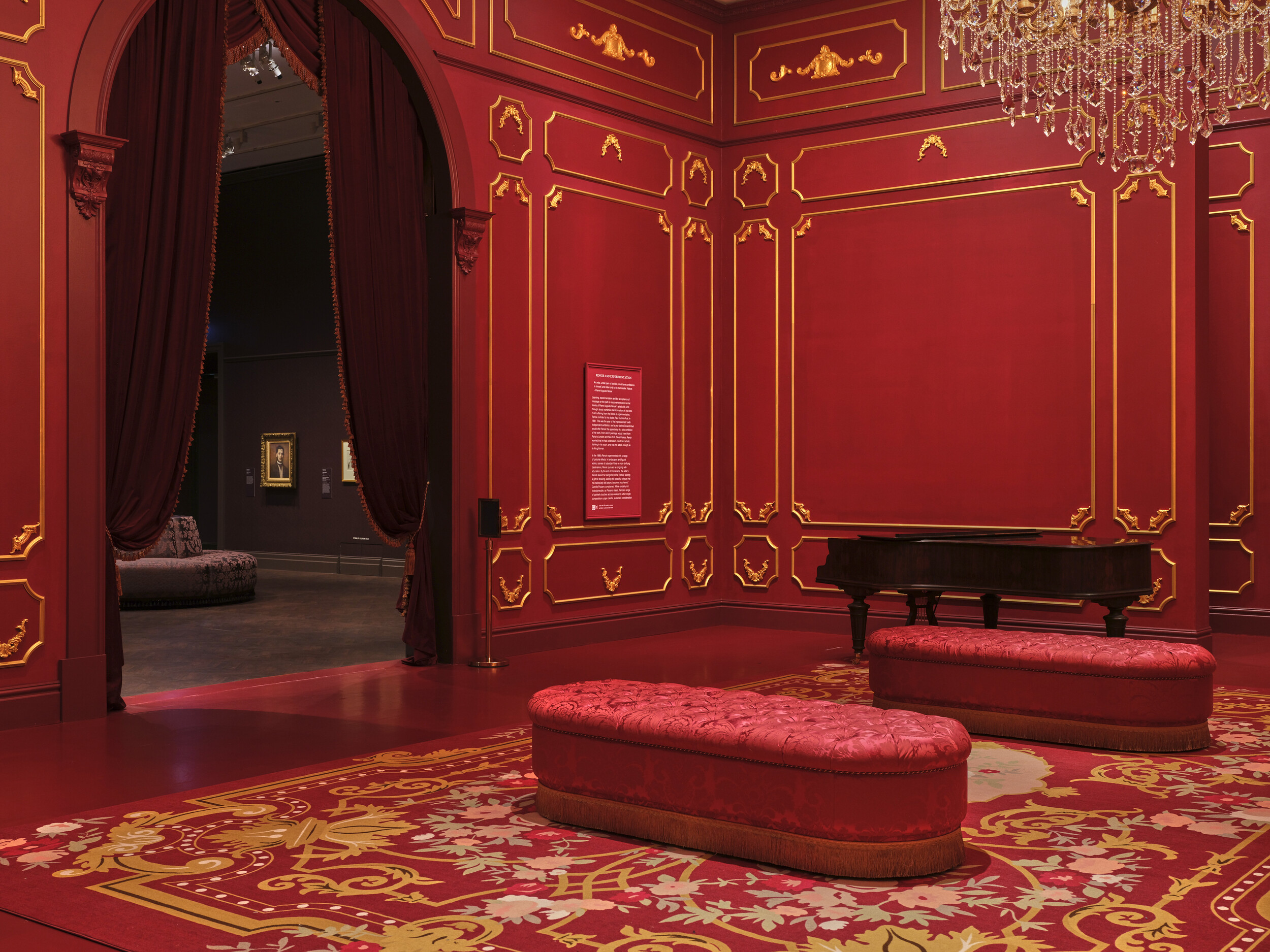 “Urban Realisms” goes dark and shadowy. It is clad in embossed wallpaper and faux gaslight sconces, evoking fin-de-siècle Parisian interiors with a Dickensian twist. Manet’s Street Singer (c. 1862) is the clear standout here. Then, before the final rooms of Monets and prints, is “Renoir and Experimentation,” set within an opulent red-and-gold salon and oversize chandelier gesturing toward Belle Époque luxury, though the effect leans more towards Versailles revival given the Louis XVI-esque panelling; a grand piano, polished and closed, sits quietly like a prop awaiting the soirée.