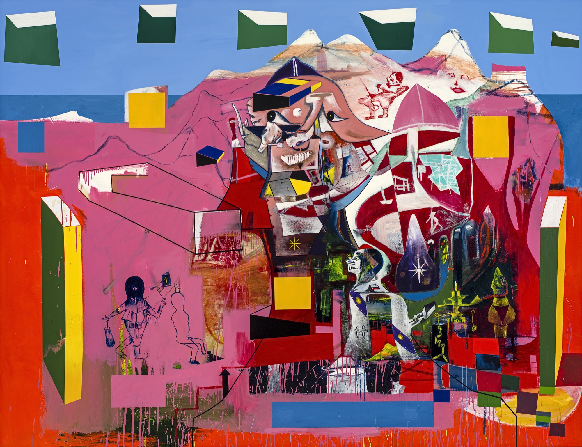 But, astonishingly – except perhaps for a moment around the late ‘70s when a series of jet airplane vapour trails seemed to drag through the work – he has managed to keep his art afloat, weightless, refusing all possible taste and curation. The only contemporary Australian painter I’d suggest who matches him in rigour is Juan Davila, who from a linguistic or psychoanalytic point of view arrives at very similar conclusions. Look at the lower-middle right of Sansom’s Friendship’s Road II and you could almost be looking at Davila’s The Studio (1984): the same cacophony of signs, symbols and styles that seek above all to remain unreconciled.