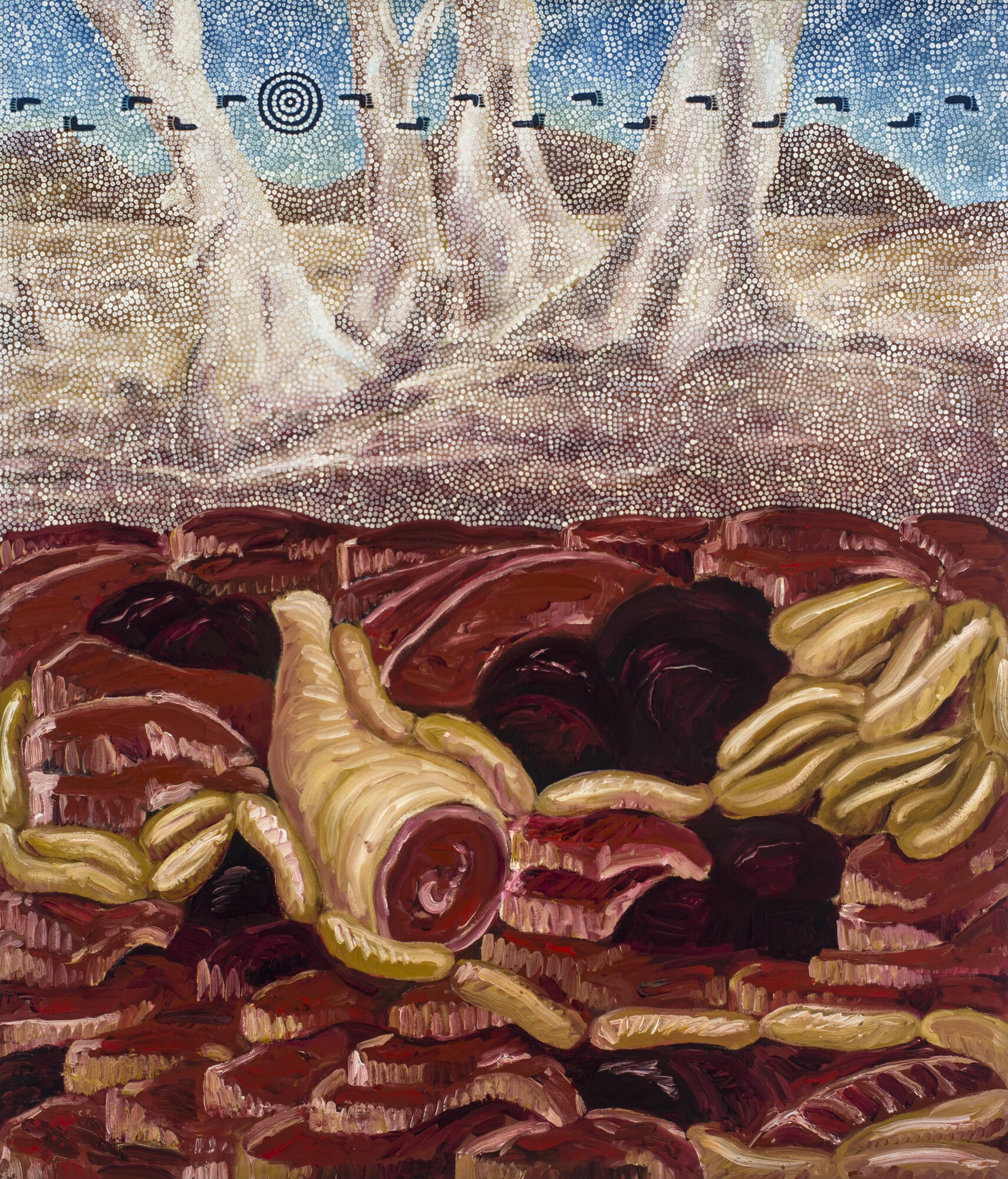 The final canvas of This World Is Not My Home, hung at the only exit and entrance to the exhibition, is Landscape Painting (1988). This work, from Gordon’s time at art school, has a cramped and fleshy quality often found in his early paintings. Thick globules of oil paint whirr in the lower section of the canvas, where Gordon has morphed the landscape into a scene of butchery. Soutine’s beef carcasses come to mind in the impasto gore. Atop this section of the painting, a receding Namatjira-style bushscape is overlaid by a swathe of shimmering dot work, recalling the Central Desert artists of Papunya. Gordon points to discussions about art market commodification and Indigenous art through these acute visual cues. The familiarity and affection that Australia has for these accepted modes of Aboriginal expression is propped up by a violent and writhing undergrowth.