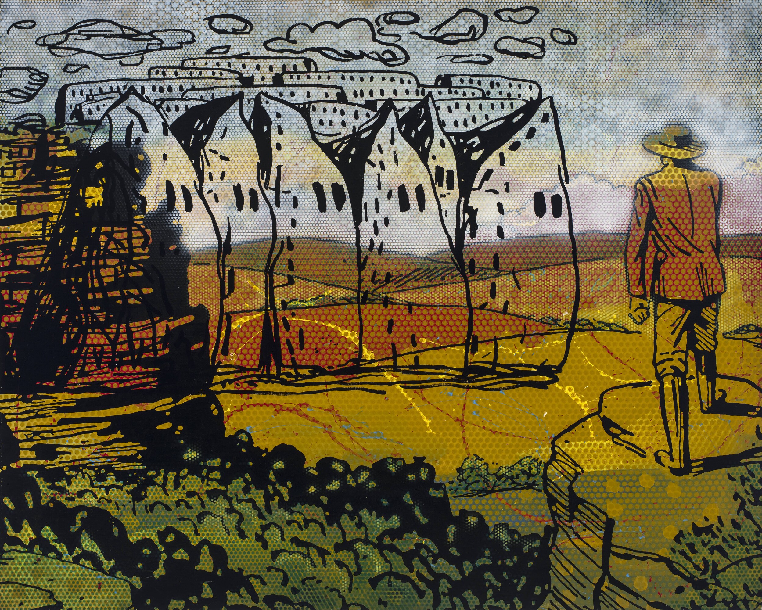 As we also encounter with Gordon’s works, Mia loads the pictorial space with threads that weave in personal reflections as well as thoughtful social commentary. The title of Section 505 derives from the current Burmese military junta’s provision of the same name, which reserves the right to punish vocal dissidents. In Myanmar, tea houses are a meeting ground for members of the community. People gather to share and discuss their lives. Under Section 505, tea houses have become both essential and acutely dangerous spaces. The quiet drama imbued in the painting again speaks of the industrial mentality the state brings to violence, which is enacted upon people and atop the land.