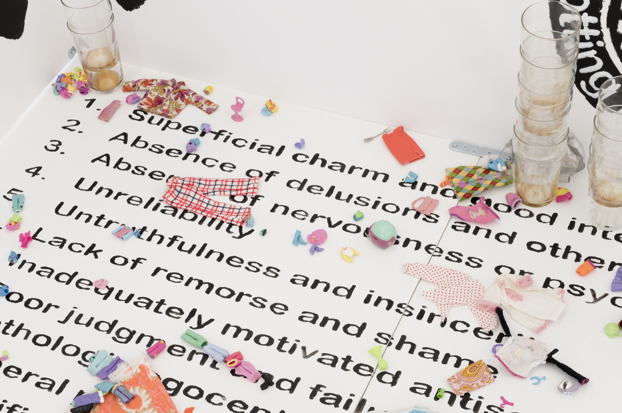 These new works appear alongside older works by Mark Smith and Ilana Harris-Babou. Smith’s ceramic text sculpture, Improvable (2019, courtesy of the artist and Arts Project Australia), further orients the show around production—the production of one’s own body perhaps. The gilded letters only reach halfway up their sides. They lean humbly against the wall. Harris-Babou’s is the only international artist in the exhibition, and her 4-minute video, a DIS-commissioned from 2018, Reparation Hardware, extends from her Larrie Gallery show in New York. Installed in the window of the new gallery and quite literally broadcasted through the architecture, using a speaker that parasitically attaches to and transforms its glass pane, the work performatively demonstrates the difficulty of pursuing a reformist agenda, by employing heavy irony. Slowly, the beginnings of some things cautiously identifiable as simply “new” work collapse back into the nightmare of history.