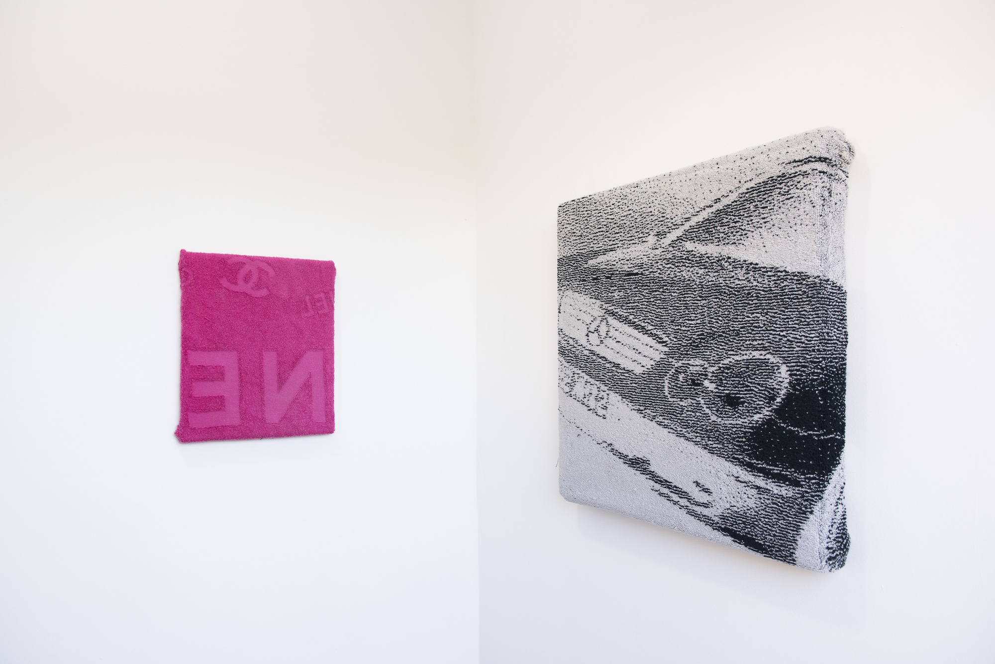 In their original incarnation, these towels pointed to material wealth (without actually embodying it). However, by the time Darcy found them in thrift stores, this allusion to luxury had been greatly diluted. The fluctuating symbolic status of a material object points to an ever-increasing conflation of consumerism with class. Each of the towels bears a very specific image that relates it to high-end material wealth. In E-Class (2020), for example, the unmistakable hood ornament of a Mercedes Benz is presented to the viewer. Meanwhile, Replica (2020) is made from a counterfeit pink Chanel towel: the fashion house’s double-C logo sits at the top of the canvas, while the large N and E of the brand’s name, although upside down, are instantly recognisable. In both instances, the images are symbols of class, but their very bizarre application to towels disavows any sense of lavishness: champagne has been downgraded to Passion Pop. The third work in the exhibition, Work Life Balance (2020), shows the silhouette of two people net fishing. This image conjures up outdated fantasies of island holidays that include romantic idealisations of “local life”. Tourism embodies a form of kitsch luxury. It is an activity developed in fantasy but eventually met with the reality of queues, blisters and McDonalds in every major city. As Darcy’s towels were beach towels, they were created with the intention of being displayed in public and, presumably, to impress. The industry for counterfeit goods, of which the Chanel towel is a product, demonstrates the human desire to peacock. Finally, in stapling her towels to canvases, Darcy pushes them even more in the direction of the fetish because now their purported function—to dry the body—has been virtually erased.