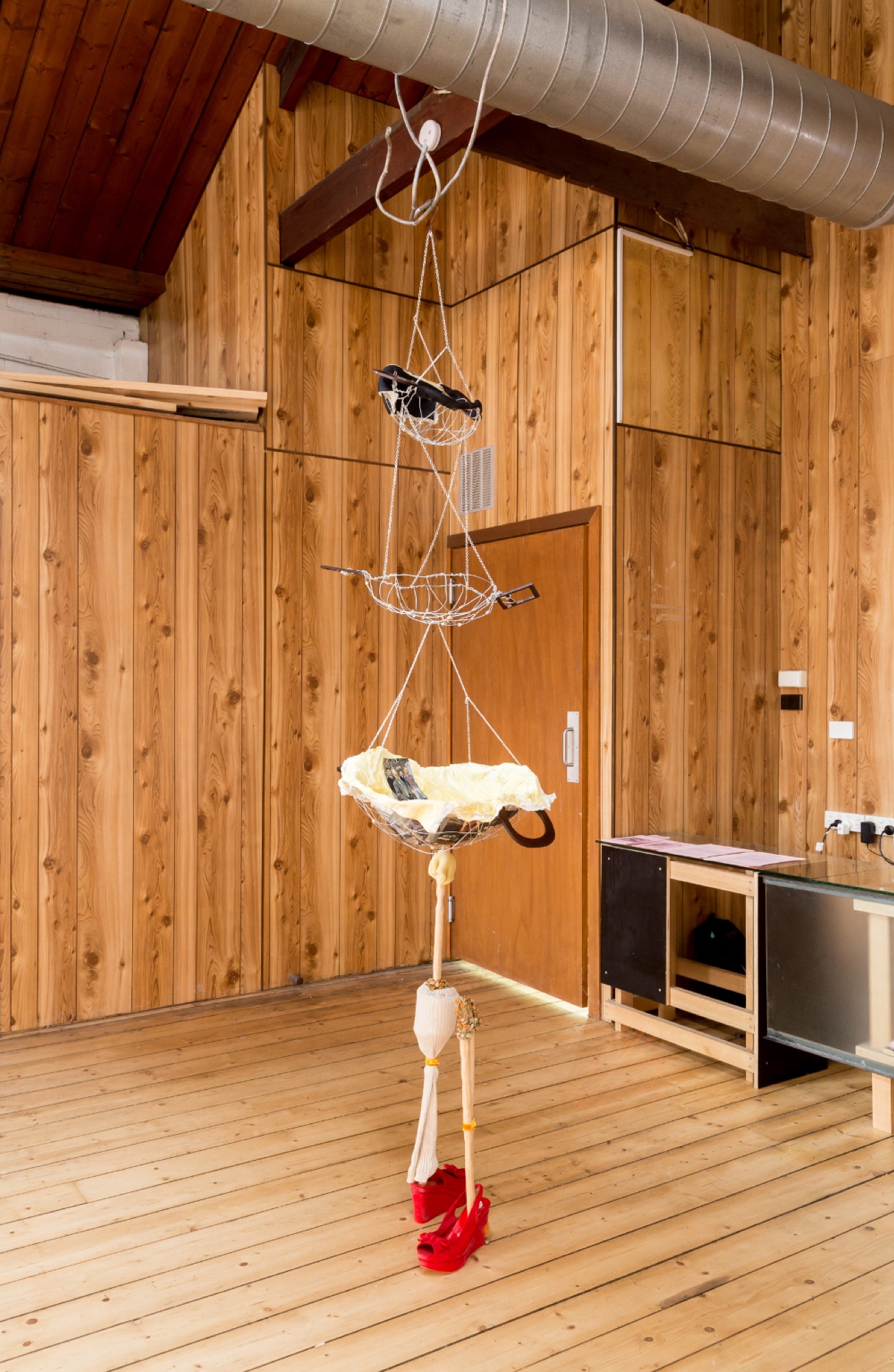In the back room, documentation of a performance intervention by Debris Facility Pty Ltd into a previous work by Vaughan at Station Gallery is projected onto the wall. And the remnants of what I assume to have been a performance by Amanda Horowitz – a trench coat and mop worn by the artist at the exhibition opening of her work, Long John Trench & Mop – are also propped up against the wall, alongside another hanging, mobile-like work by Horowitz, Missy Made Baskets.