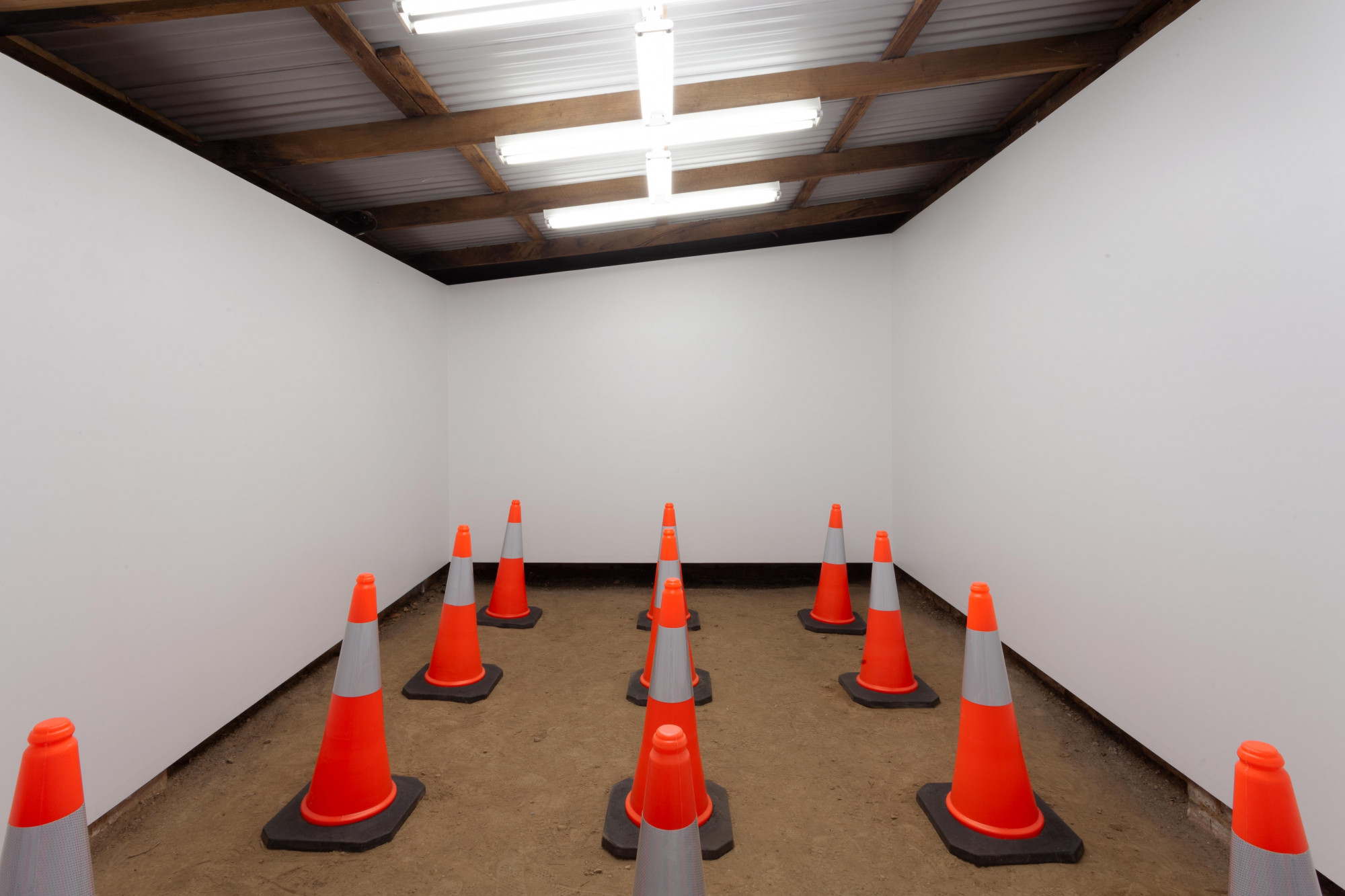 Room Based is Merlin Carpenter’s first Australian solo exhibition at Guzzler, curated by David Homewood, Luke Sands and Alex Vivian out of their Rosanna share house. In their small backyard shed turned meticulously white-walled but still dirt-floored gallery, they have faithfully followed Carpenter’s managerial orders to fill the space with fifteen European-style orange and silver traffic cones purchased out of their own pocket in a five by three symmetrical arrangement.
