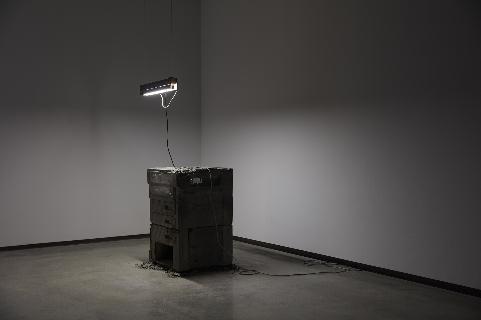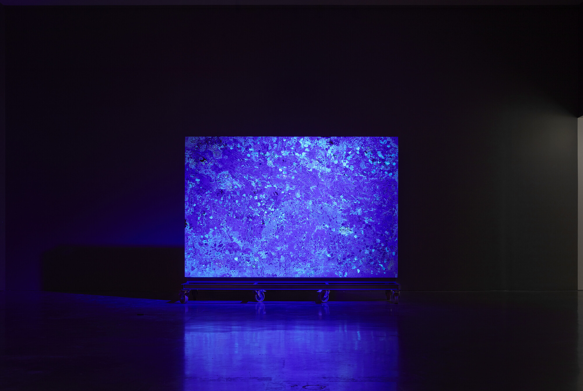 In the exhibition’s final room Mangan seems to address this point directly. The darkened room includes a trio of works from his most recent Core-Coralations project, which focuses on the Great Barrier Reef. The centrepiece is Death Assemblage (2022), a large two by almost-three metre slab, tilted slightly backwards on a black metal frame that recedes into the darkness. The slab is an accumulation of dead coral fragments, held together by a glue of argonite (the base mineral in coral) and epoxy. The regular pulses of a UV light activates a bioluminescent pigment in the sculpture, producing a rhythmic glow of neon blue. The light is gorgeous, and invites the kind of transcendental experience that Mangan’s work usually denies. As Mangan has explained, however, the flash alludes to the light some corals emit in response to heat stress—a reminder that an escape into the aesthetic comes at a great worldly cost.