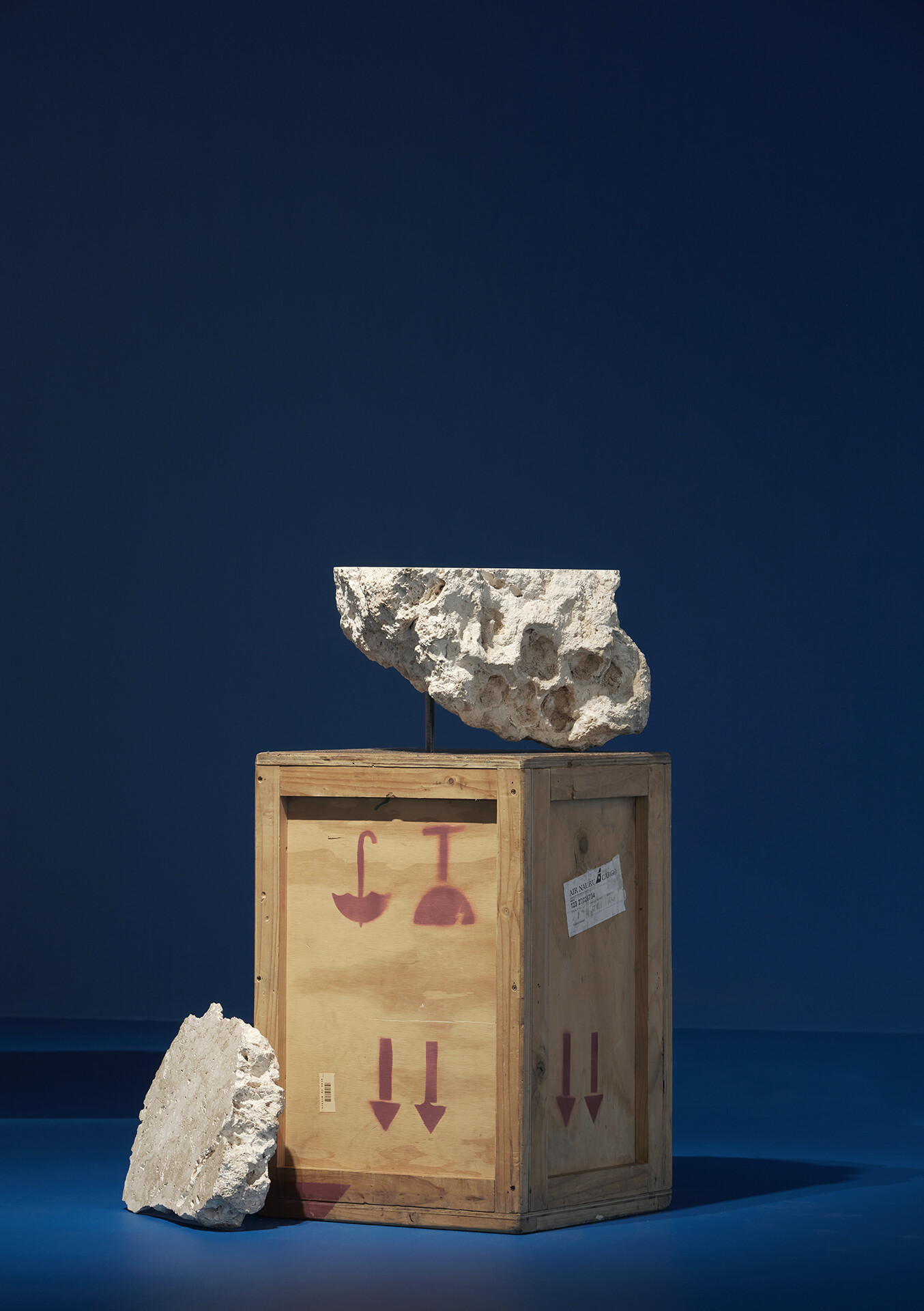 Nicholas Mangan, Proposition for Dowiyogo’s Ancient Coral Coffee Table, 2009, installation view, Nicholas Mangan: A World Undone, Museum of Contemporary Art Australia, 2024, coral limestone from the island of Nauru, wooden travel crate, image courtesy the artist, Museum of Contemporary Art Australia and Sutton Gallery, Australia © the artist, photograph: Hamish McIntosh.