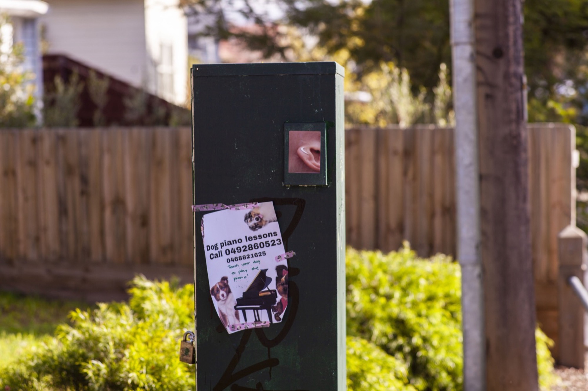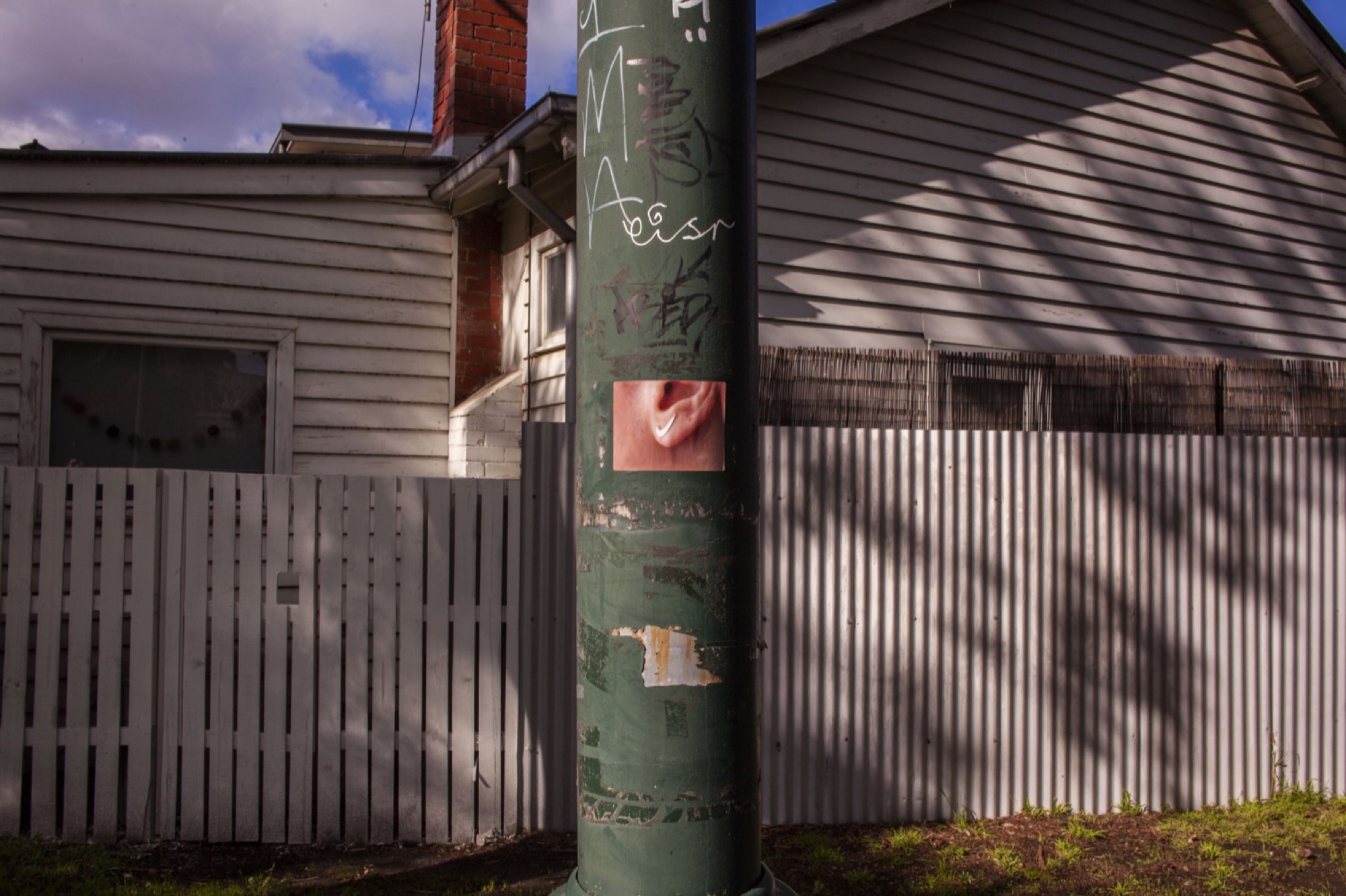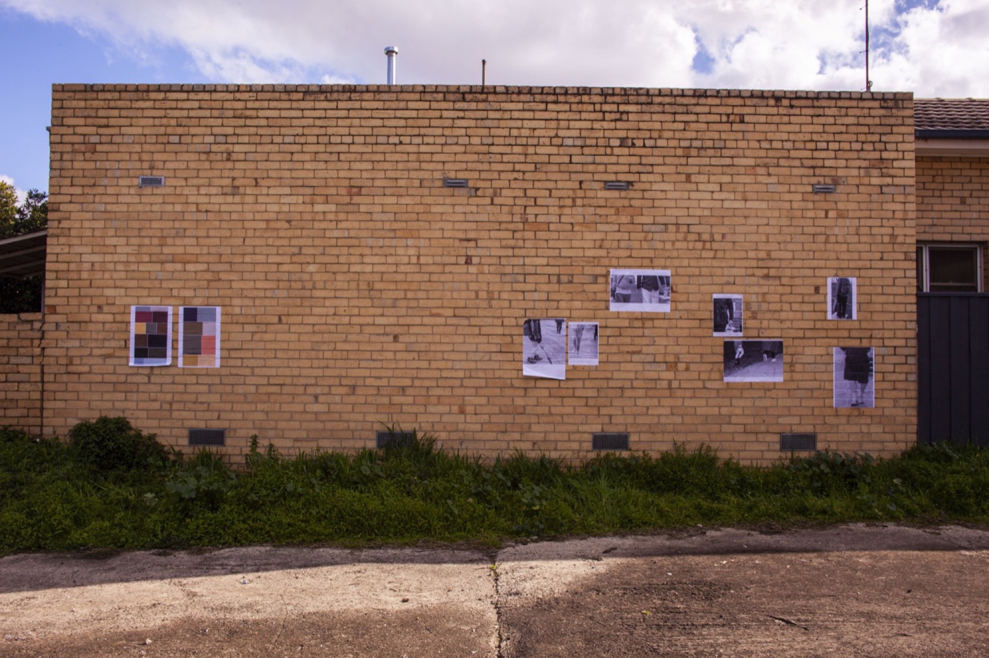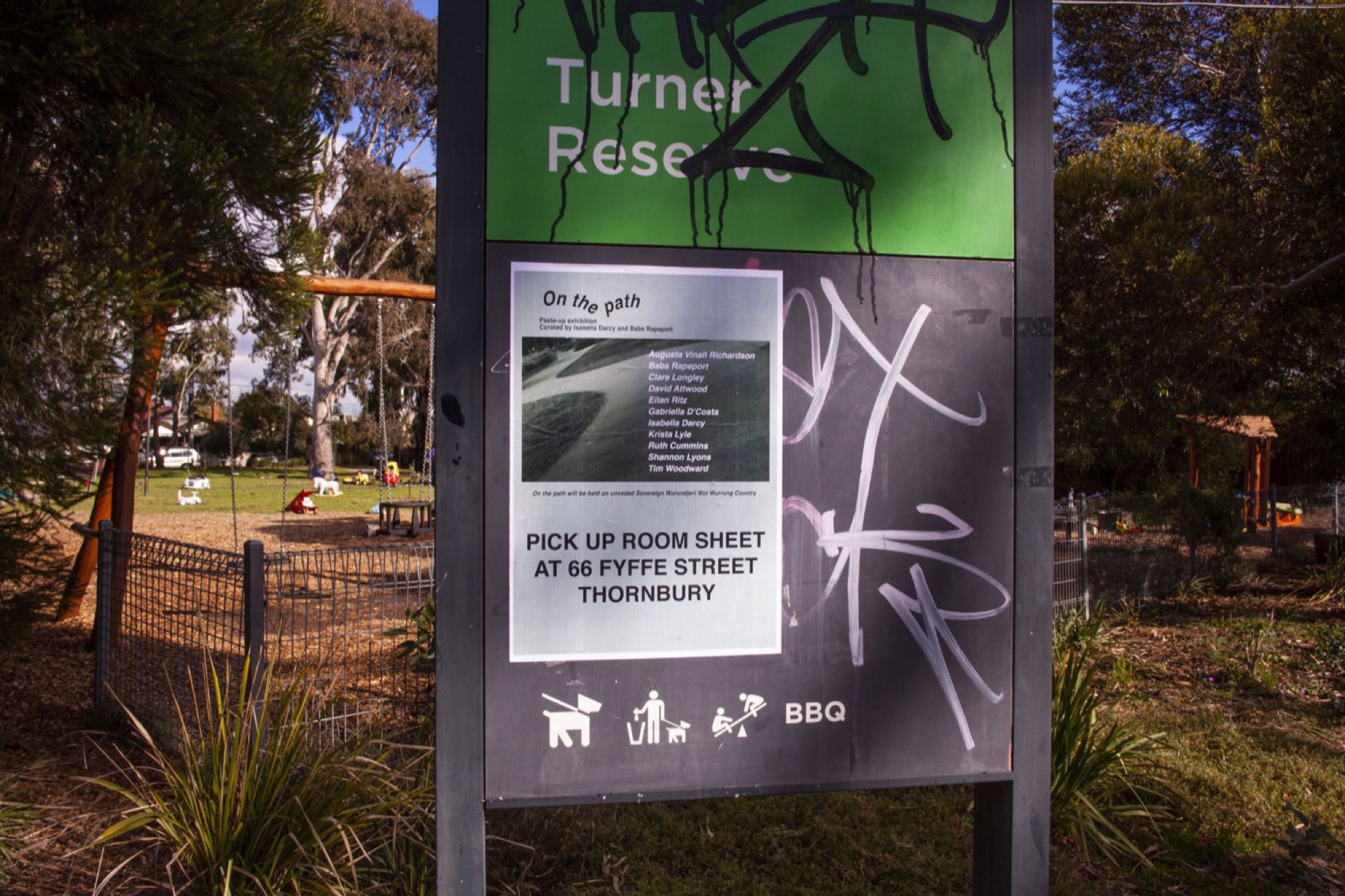 The show crossed the seven blocks of a snaking nature strip called Bracken Avenue. Our first foray down the path was slightly disoriented. Beginning in the middle at a Fyffe Street coffee station hosted by the curators, we were provided with a map and made our way towards its due north (cardinal south, it turned out) in search of a water drain. We encountered others who had turned back, lost. They wished us luck. Trying to identify the distinctive idioms of each artist along the way felt like a test of our collective memory. David Attwood loves logos–that must be his. Didn’t Gab D’Costa do a climbing wall work at that Thornbury gallery the other month? Is this “Dog Piano Lessons” poster a part of the show? It wasn’t.
