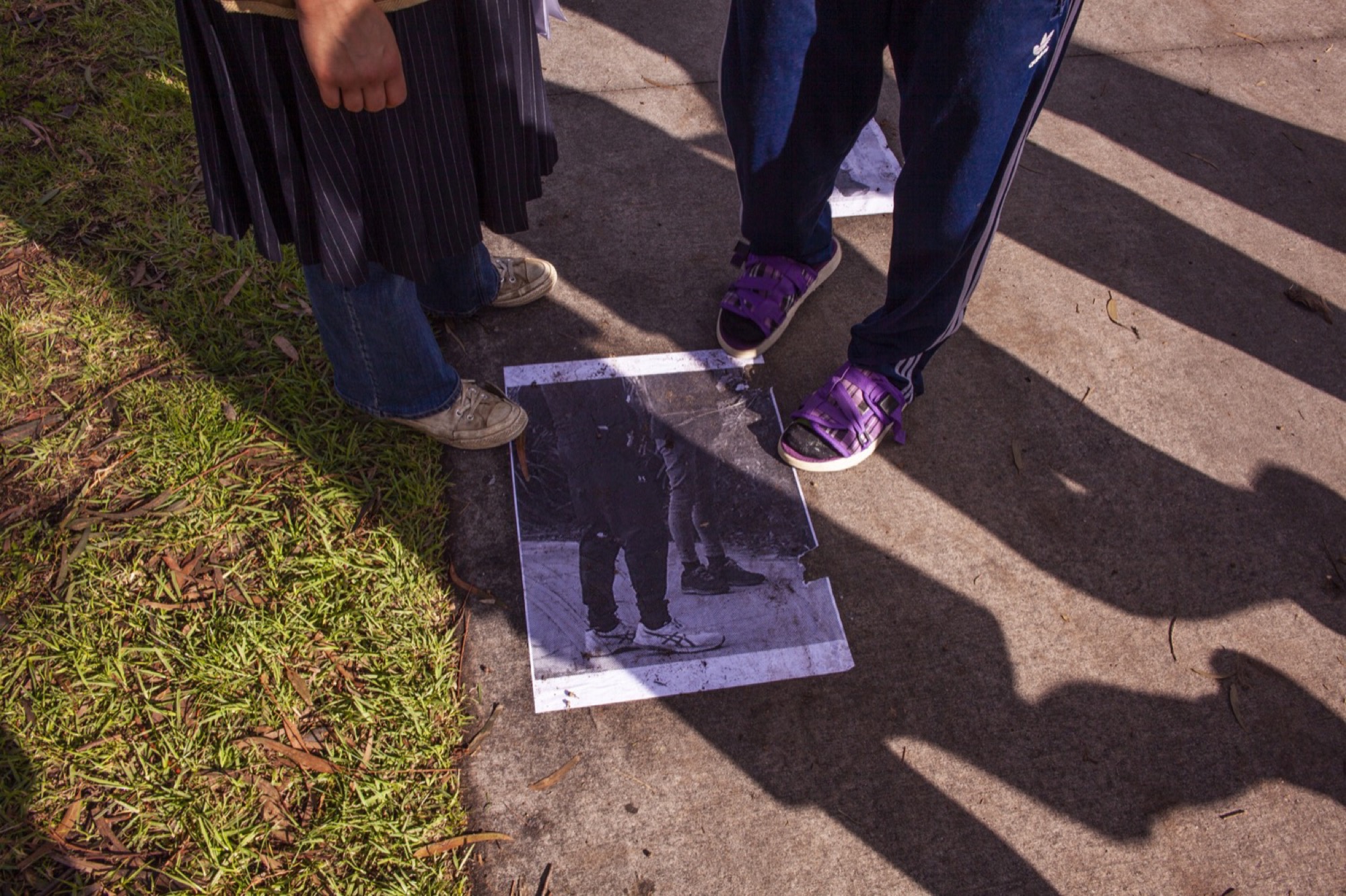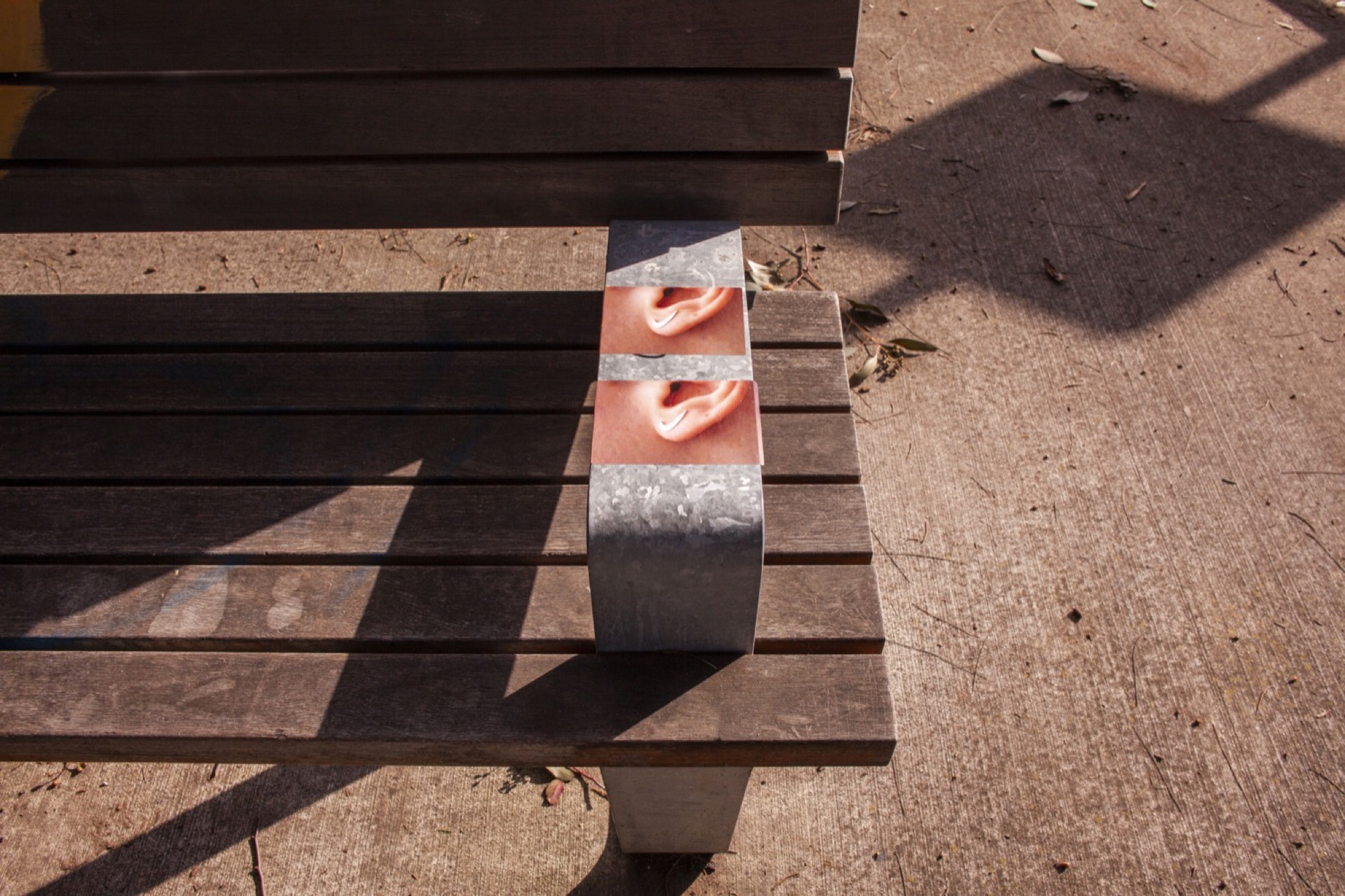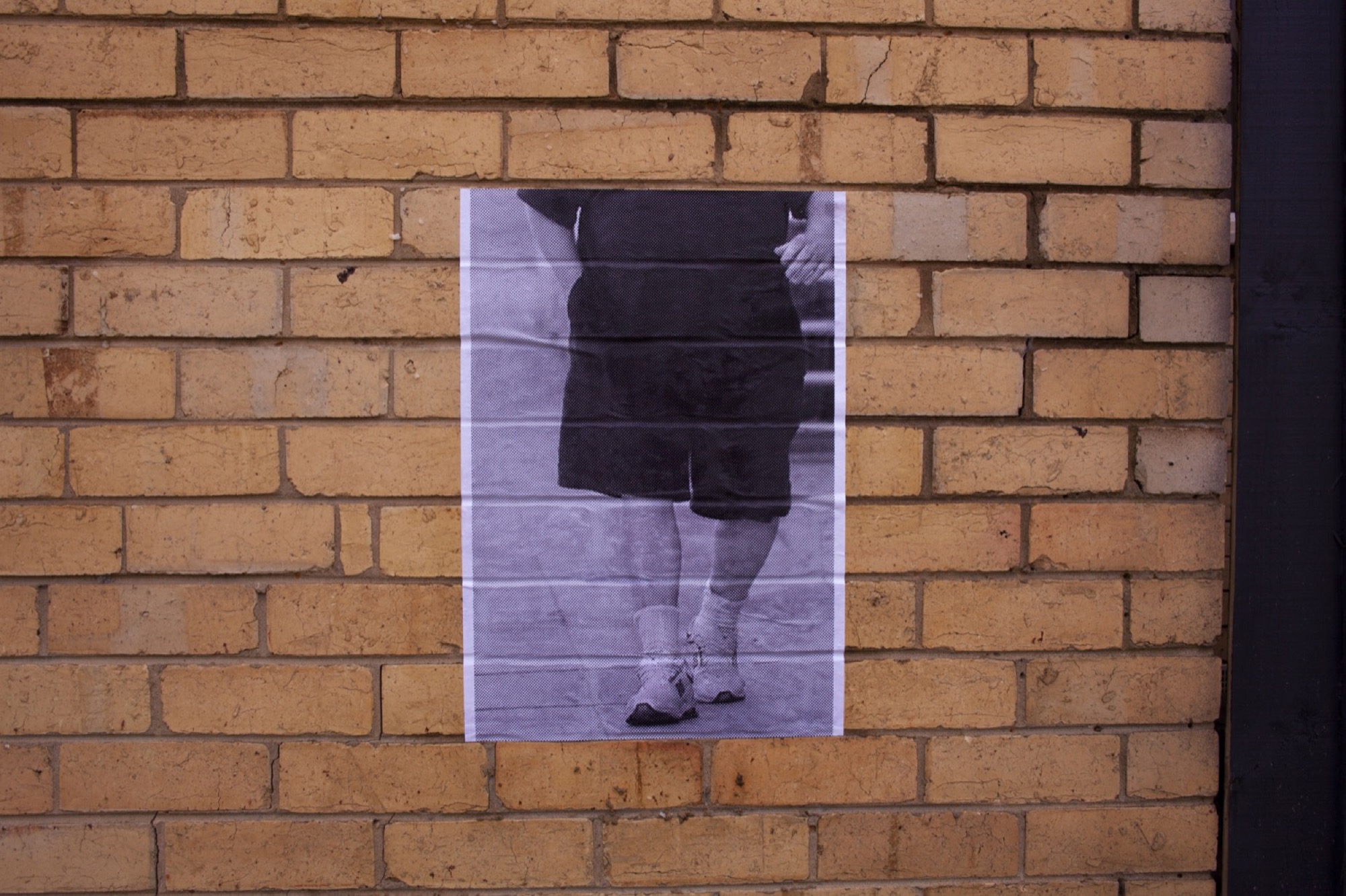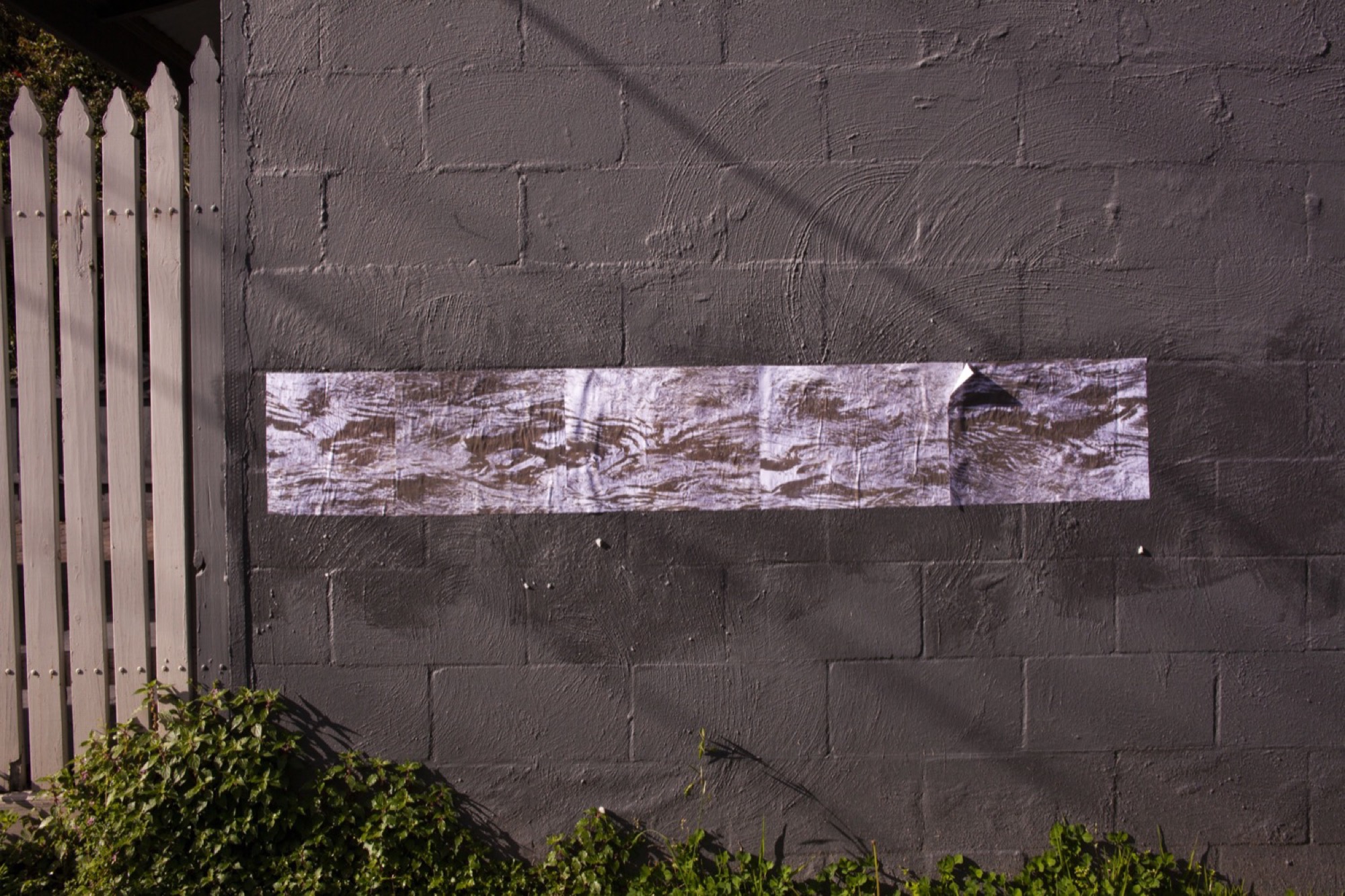 The show crossed the seven blocks of a snaking nature strip called Bracken Avenue. Our first foray down the path was slightly disoriented. Beginning in the middle at a Fyffe Street coffee station hosted by the curators, we were provided with a map and made our way towards its due north (cardinal south, it turned out) in search of a water drain. We encountered others who had turned back, lost. They wished us luck. Trying to identify the distinctive idioms of each artist along the way felt like a test of our collective memory. David Attwood loves logos–that must be his. Didn’t Gab D’Costa do a climbing wall work at that Thornbury gallery the other month? Is this “Dog Piano Lessons” poster a part of the show? It wasn’t.