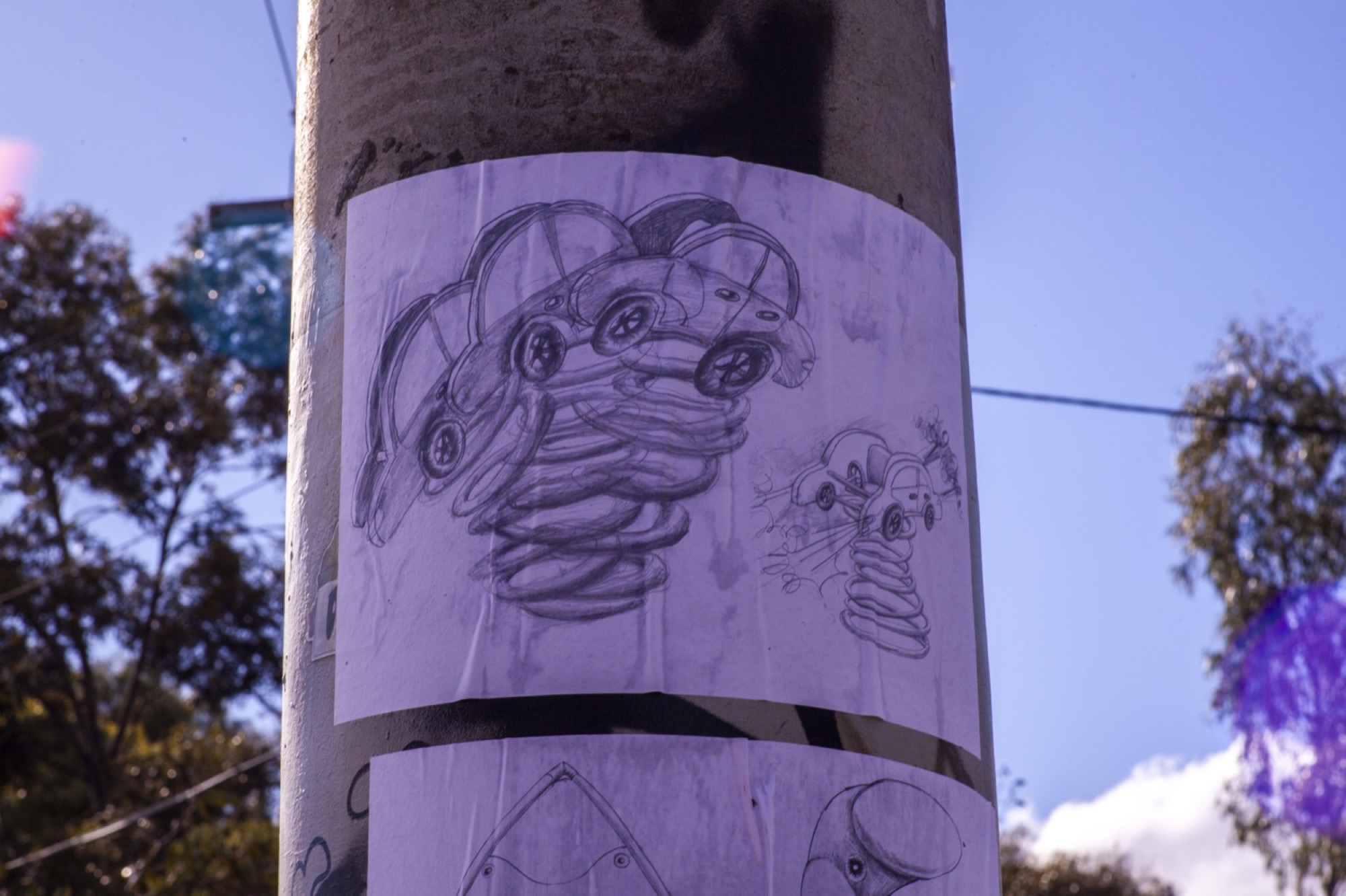 Also in Turner Reserve and pasted-up just one power pole before a Ritz river was a two-sheet drawing by Australian Tax Office employee (aka @deceased_bureaucrat) D’Costa. Her drawings reflected the park’s toy collection, a litter of plastic cars, trucks, ponies, and climbing equipment. One drawing depicted two motor vehicle playground spring-rockers in motion, recalling Giacomo Balla’s 1912 Futurist masterpiece Dynamism of a Dog on a Leash. A rocker gushed green-house gases out its exhaust pipe. Do these inner-city lefty parents (there’s a bold “Defend the ABC” banner just down the path) forget they’ve got the kids play-acting a carbon-emitting future on the front lawns?