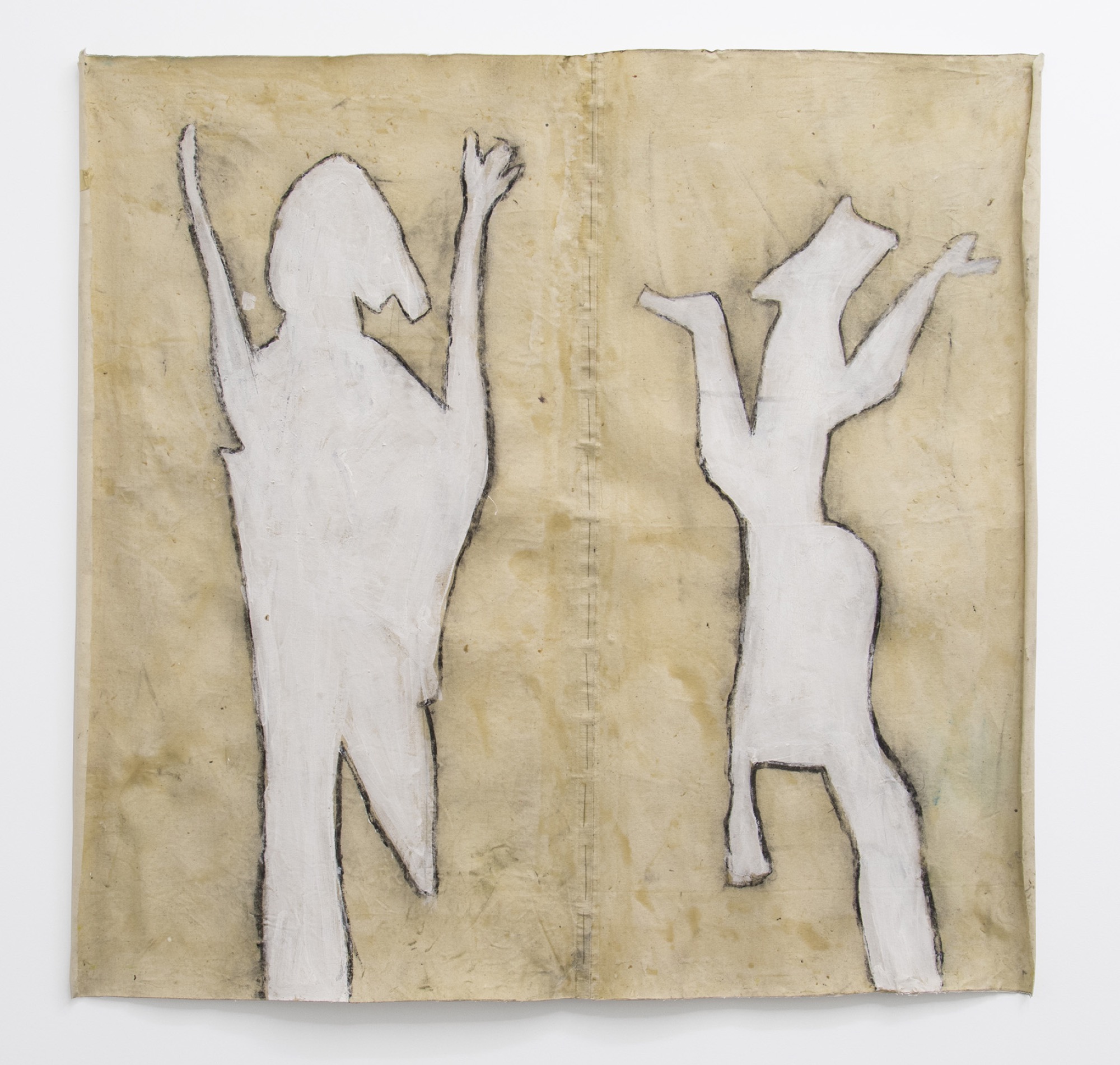 If (to take one classic reading) the language of the avant-garde taught us that abstraction was a reference to the machine and figuration to the body, then the constant back and forth between the two dominant painting styles indicates a very skewed version of the contemporary moment predicted by the avant-garde. However, the relationship between the human and machine is not as euphoric today as it was in the twentieth century. I mentioned earlier that the abstraction seen in Preparation still values the hand. We see this in the work of Sibylle Czichon and, in particular, Julius Linnenbrink. But Linnenbrink's works are slicked with almost toxic sheens and painted in caustic colours that evoke unnatural, human-made things. Eye and Ear (2019)—a small, slimy green painting, murky with layers—sits next to Jake Madel's untitled acrylic and rabbit skin glue work that depicts what appears to be two outlines of dancing human figures, arms in the air. Lacking identities, they nonetheless dance upon the, rabbit skin glue base, a material used by humans for centuries. The interplay between the very natural animal-derived material and Madel's use of the acrylic paint to evoke the synthetic encapsulates the unease that the contemporary has made of the avant-garde vision.