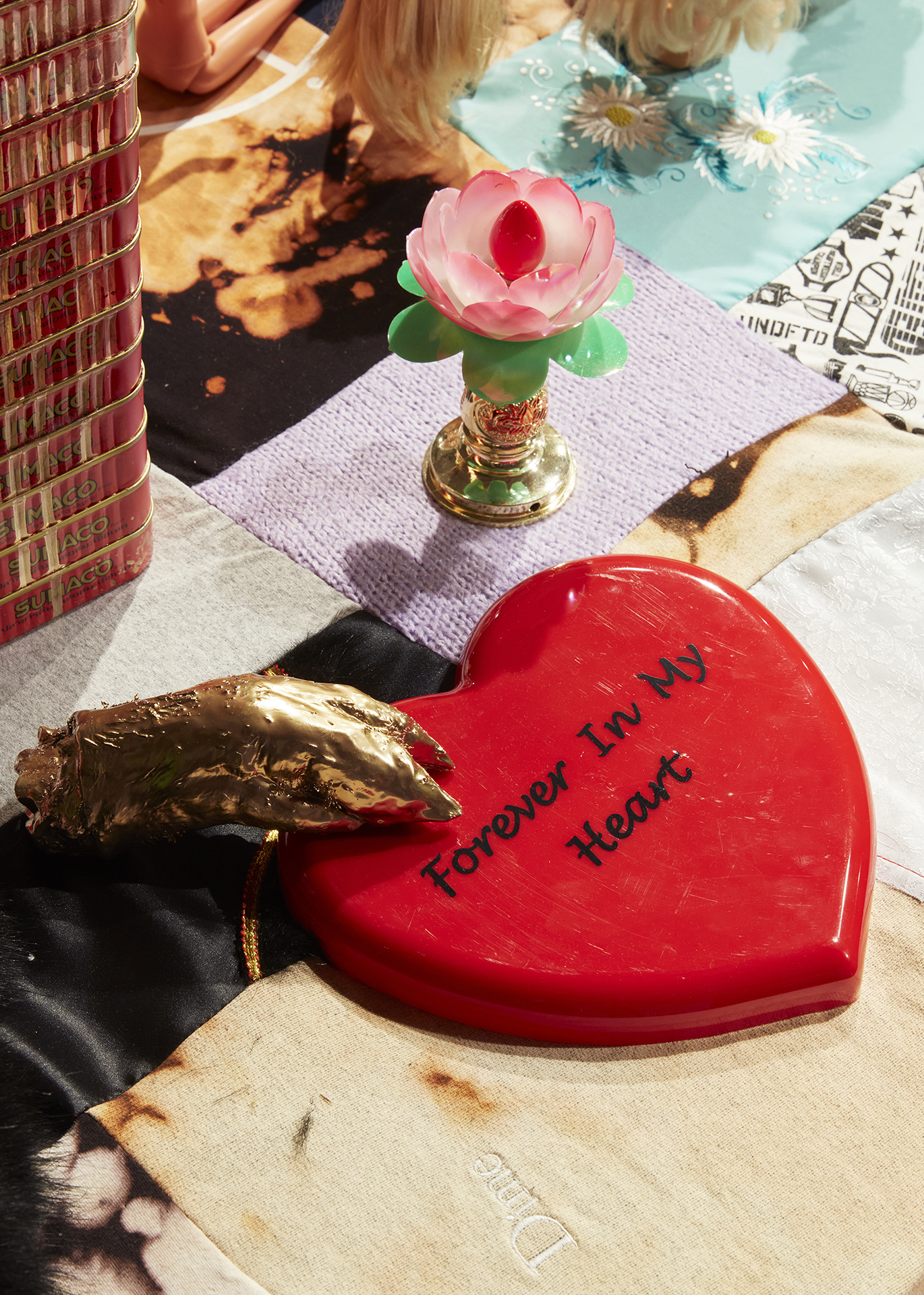 Truc Truong’s tornado-style installation I Pray You Eat Cake (2023) explores the conflicted feeling of living away from an ancestral land that is foreign to you, to exist as a migrant in a country that is not your own. In 1982, five years before Truong was born in Tarntanya/Adelaide, her family left Vietnam to build a life in Australia, farewelling a Saigon that no longer exists. On a scarlet-red, half-moon stage, Truong presents a peppering of mass-produced toys, found objects, and fabrics that evoke memories of childhood trauma and healing. I spot, for example, a gnarly crucifix fashioned from dishevelled Barbie dolls, and feel a childhood-rage that jibes with my own Asian migrant experience. When I was seven, my father surprised me with a Barbie doll—the type that would be classified as “stereotypical Barbie” in Greta Gerwig’s blockbuster movie. I suppressed my confusion with this Euro-faced, golden-haired plaything by using charcoal ash to stain Barbie’s locks and blackening her blue eyes with felt pen, so she could somewhat resemble me. I made what Gerwig might call “Weird Barbie”—because of course, any alteration that strays from confectioned Western beauty is an act of bodily dissent, a vandalisation.