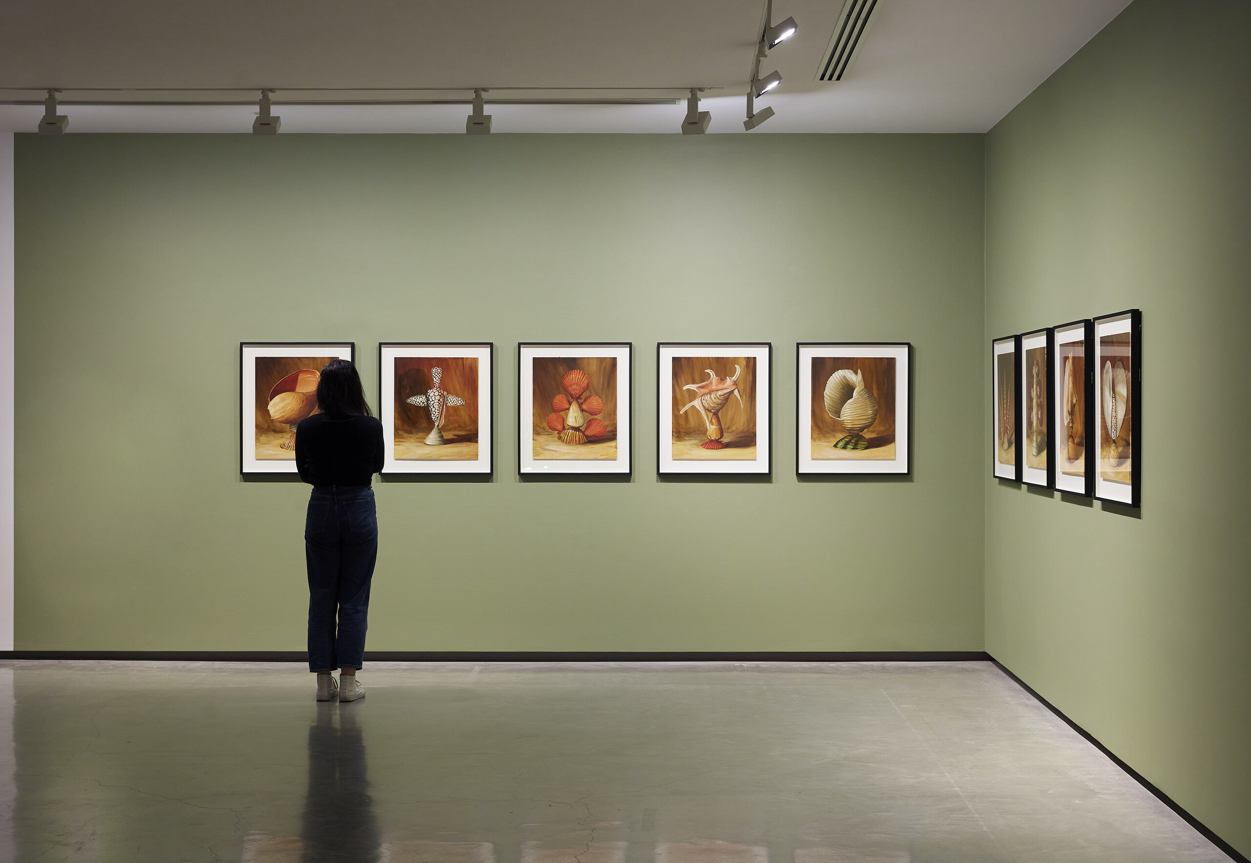 Christopher Bassi’s tantalising suite of nine framed oil paintings of seashells gestures towards the history of fishing, pearling, and shell trade in the Arufa Sea. For Monuments to the South/West Waters of a Great Ocean (2023), the Meanjin/Brisbane-based artist places contorted pearlescent and dotted shells against a rusty-merigold background, turning them into fantastical monuments that resemble neoclassical scenes.