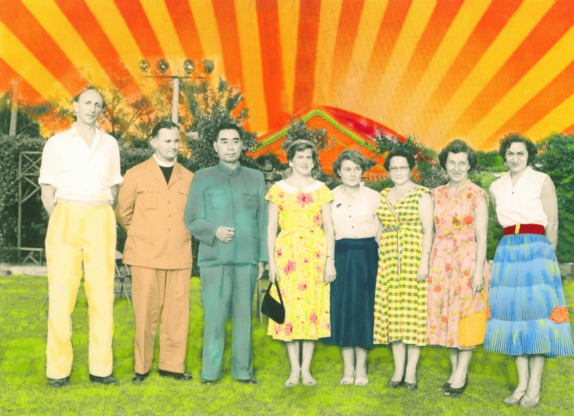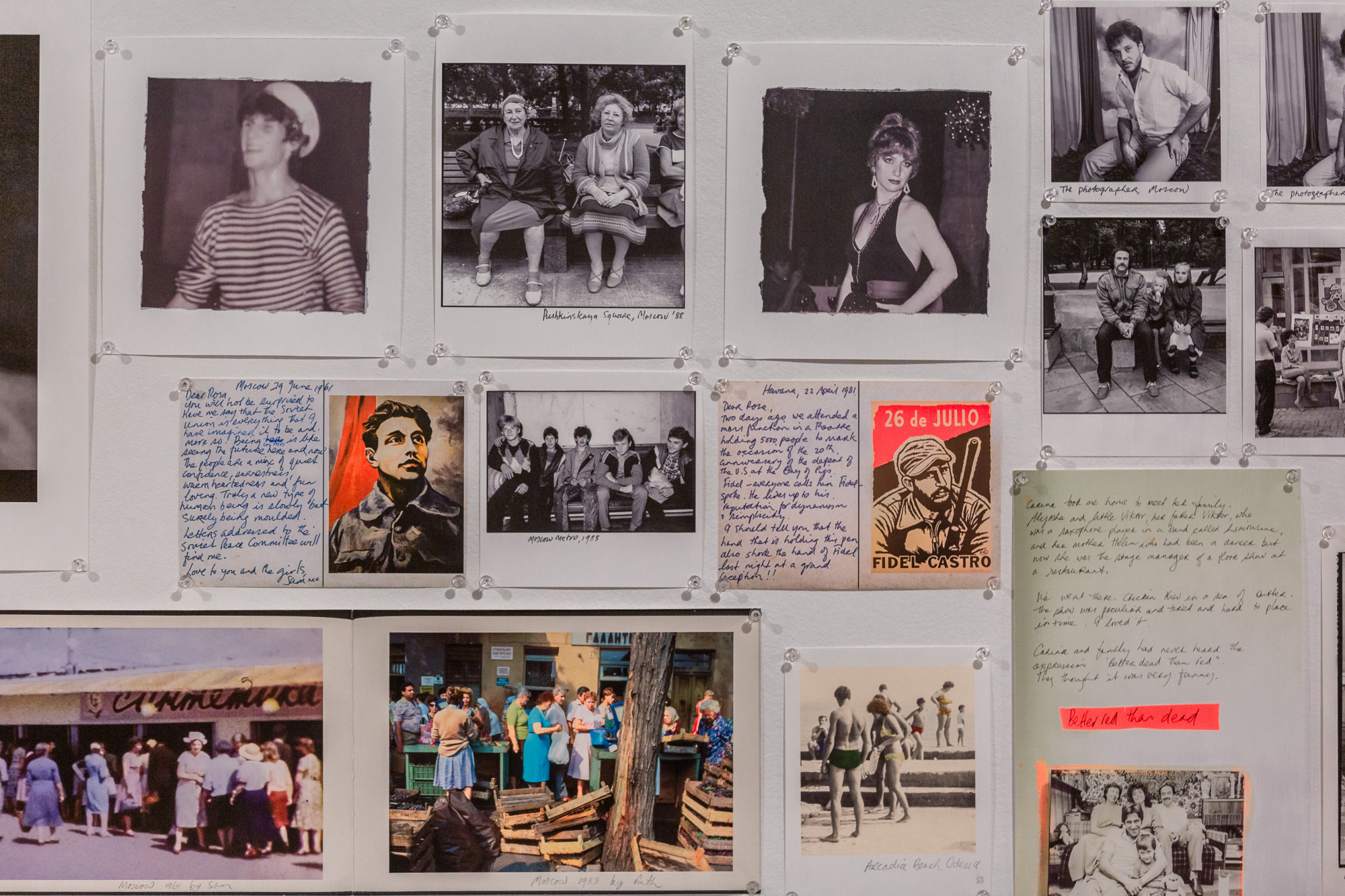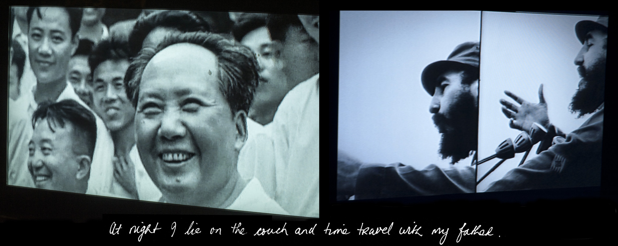 The wall connecting this large space to the rest of the exhibition is wallpapered with reproductions of his political and peace movement posters along with blown-up versions also hanging up in the space. As Ruth’s father was on the World Peace Council from the mid-1950s to 1980s, a lot of travel to anti-war conferences were made to Soviet Russia, China and Cuba. An abundance of archival material, footage and hand-coloured photographs reconcile and reimagine Ruth’s father and his past. A selection of photographic prints is blown up, hand-coloured and framed, often editorialised and commented on by Ruth, either as a form of speculation or through her imagination in order to recollect or even reconcile her father’s life. Are memories reliable or can we only know what we choose to remember? Is the past what we think it is?