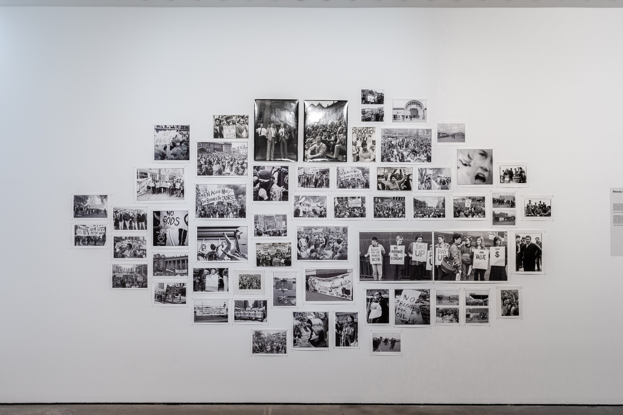 Ruth’s politics are reflected in the creative feminist communities she documented. It is most evident in one of the largest clusters of framed and unframed portraits of the many artists, friends, performers, writers, photographers who have crossed paths with her camera over the past four decades. In a series next to these portraits, Ruth documents rallies, protests and picket lines from the 1970s to late 1980s in a series of black-and-white prints. We see in them groups of women holding hand-painted signs: “EQUAL PAY FOR WOMEN NOW”; “LESBIANISM: THE ONLY SOLUTION”. This collectivism gets flattened by the individualising slogan that “the personal is political”, which is found on one wall label to suggest private personal interiority rather than the public political action documented in these photographs.